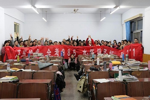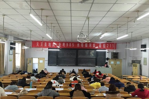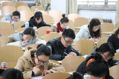 本次考试采用2017年真题,严格按照正式考试标准进行。考生提前15分钟入场,由工作人员检查身份证、学生证等证件。距离开考5分钟,监考老师将试题、答题卡依次分发。考场内安静有序,学生们迅速进入到紧张的答题状态。整场考试学生们沉着细心,监考老师尽职尽责。考试结束后,考生们互相讨论,分析考试过程中出现的问题,肯定模拟考试的积极作用,并在助考横幅上签字留念,勉励彼此。