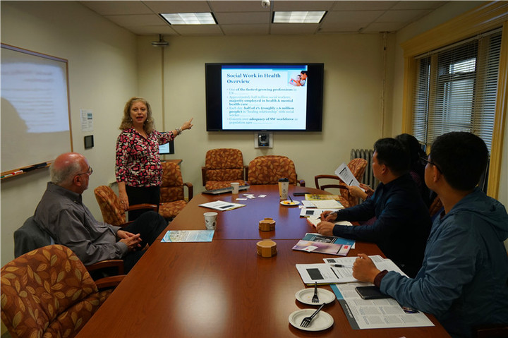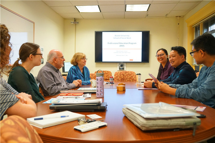 代表团参观访问了波士顿大学“社会工作创新及健康研究中心”“老龄化与残疾人教育研究中心”两个国家级研究中心,分别会见了中心主任Dr. Sally Bachman博士和BronwyeKeefe博士,就社会工作创新与公共健康教育、创伤疗法最新进展等进行了学术交流探讨。代表团同人类学系主管研究生教育的RobertP.Weller教授就中美本科生、研究生课程设置、课堂教学模式、课程考核指标、研究生培养方式等问题进行了深入交流。代表团实地考察了波士顿大学社会工作学院的实习合作机构“社区老年人居家养老照护中心”,并就居家养老的运作模式、项目评估及发展瓶颈等问题进行交流。