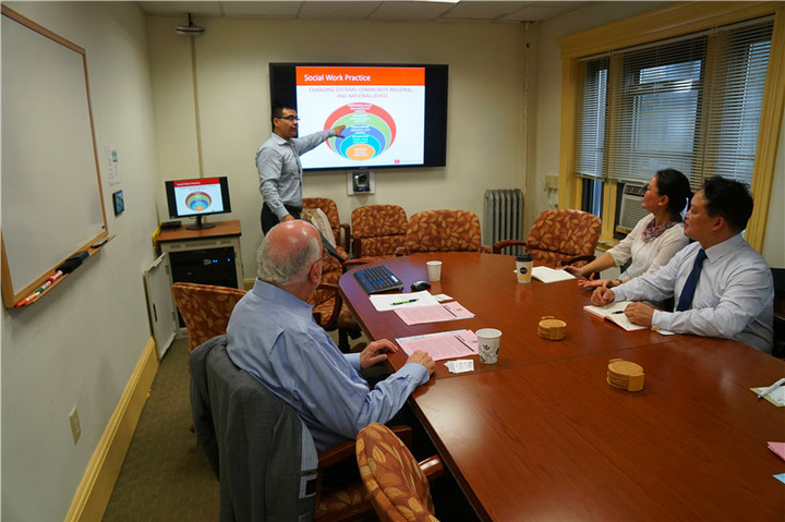 在美访问期间,波士顿大学社会工作学院院长JorgeDelva教授、副院长KenShulman教授为此次访问做了精心准备,在访问日程、会谈方案、考察行程、具体接待等方面做出周密安排。代表团同波士顿大学社会工作学院进行了深入交流和广泛探讨。双方通过形象宣传片和PPT介绍学校、学院情况,增进相互了解与文化认同。双方就学术交流、科学研究、课程设置、教师互访、人才培养等事宜,进行了坦诚务实会谈并达成合作共识。