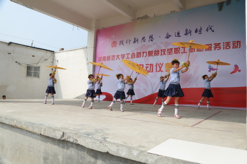 文艺演出环节,当地的孩子们用欢快的舞蹈《不忘初心》和《彩云之南》欢迎我校领导老师的到来,我校音乐舞蹈学院学生代表则一展歌喉,为村民带来戏曲《朝阳沟•上山》选段和《村官李天成•吃亏歌》选段,精彩的表演获得现场观众热烈的掌声。随后,柳湾好少年为各位领导佩戴红领巾,仪式至此落下帷幕。