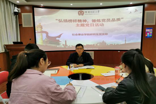 10月30日上午,我院研究生党支部在社会工作专业实训室开展“弘扬榜样精神,锤炼党员品质”主题党日活动。活动由党支部书记梁作振主持。