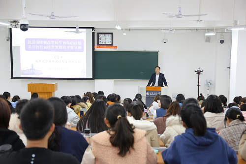 11月28日,应我院邀请,南开大学社会建设与管理研究院院长关信平教授在东区综合楼104室作了主题为“我国保障和改善民生70年的经验及当前社会政策发展的主要议题”的学术讲座,学院相关专业教师、学生200余人共同聆听本次讲座。讲座由社会事业学院党委书记魏雷东主持。