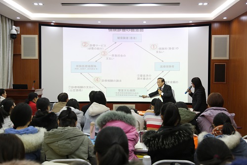 讲座中,黑田研二围绕“日本社会保障制度和医疗保险制度”,从“日本人口高龄化的现状” “社会保障制度的形成演变” “医疗保险制度的主要内容” “医疗提供体制的重组” “日本长期护理保险制度及地域综合养老服务体系的实践现状”等五个方面展开讲解。针对日本人口老龄化现状,他结合具体数据深入分析世界的人口老龄化趋势,提出人口老龄化和少子化是大势所趋,进而深入剖析了日本老龄化的特点、现状、未来发展趋势及应对措施。谈及日本医疗保险制度,黑田研二以时间为轴,结合图表分析了自二战后日本医疗保障制度的发展变化,着重讲解了日本高龄者医疗保险制度的发展沿革。在谈到长期护理保险制度时,他从日本老人医院制度和老人福利制度的问题入手,以京都社区融入型服务实践为例,详细讲解介护保险制度的主要内容及变化,并提出理想化社区的构建蓝图。黑田研二强调,中国和日本有着相似的文化传统,面临共同的发展难题,应相互借鉴,共谋发展。