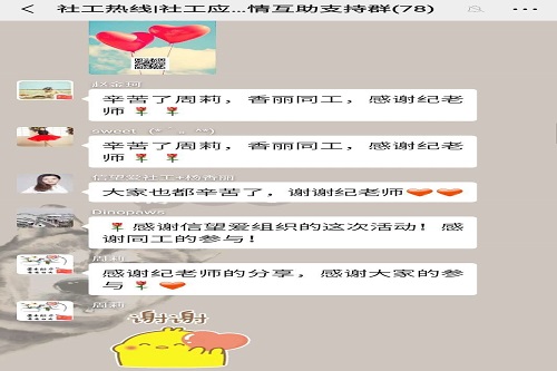 基于此,郑州社工热线项目建立了微信互助支持群,借助微信群为社工朋友们提供一个线上学习交流的平台,通过问卷调研的形式了解一线社工的实际需求,并通过“互助支持群+专业老师定时分享”的形式开展相关服务。