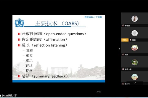 培训正式开始后,纪老师首先从动机访谈的理论出发,对动机访谈的核心理念、基本原则、ME(动机增加)的精髓及主要技术等内容做了深入浅出的分享,并通过分享具体的案例增进大家对相关内容的了解。接着,纪老师着重讲解了动机促进访谈法的5个关键原则:表达共情、创造差异、避免争辩、处理阻抗和支持自我效能感。培训中,纪老师适时与大家做互动,并带领大家练习开放式提问、肯定、反馈式倾听和总结等以引出对改变讨论的咨询技巧。互动交流环节,大家也针对实际工作中遇到的问题做提问交流,纪老师也详细的为大家一一做解答。最后在愉悦的氛围中结束了本次培训。