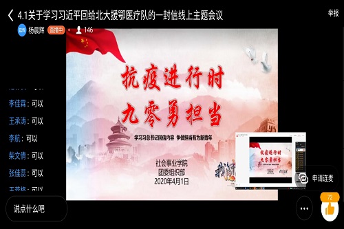 3月30日至4月2日,在学习“习近平给北京大学援鄂医疗队全体‘90后’党员的回信”精神主题团日活动中,各团支部以直播学习、线上团课、微信讨论等多种形式展开了学习热潮。其中,社会学类专业2019级社会学类班团支部借助腾讯会议、学习强国平台开展线上活动,共同学习了习近平总书记的回信,并围绕“回信精神”聊感想、抒体会。活动结束后,青年学生反响热烈,纷纷表示深受教育和激励。