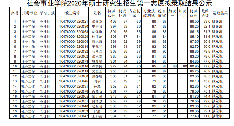 根据社会事业学院2020年硕士研究生招生复试及录取办法,现将复试及拟录取结果公示如下:
