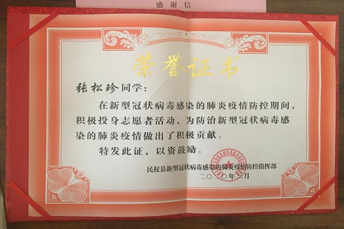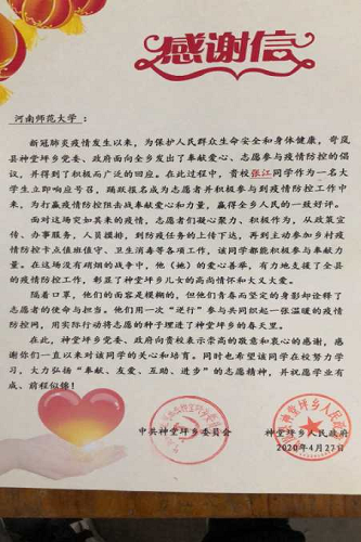 信中写道:“在新型冠状病毒肆虐,四处扩散,威胁着人民群众的生命安危之时,志愿者凝心聚力、积极作为,贵校社会事业学院2019级社会学类专业张江同学自愿参加我乡抗击疫情志愿者,用实际行动诠释了志愿服务精神,展现了新时代大学生的精神风貌,担起了新时代青年肩上的重任。”“贵校学生张松珍积极参与疫情防控志愿服务队,在家乡需要之时,挺身而出、勇担使命,尽己所能、贡献力量。其优秀表现,赢得了民权县委、县政府及社会各界的高度认可。”此外,信中还提到,感谢贵校社会事业学院一直以来对该同学的关心与培育,同时鼓励其不负学院的培养与教育。
