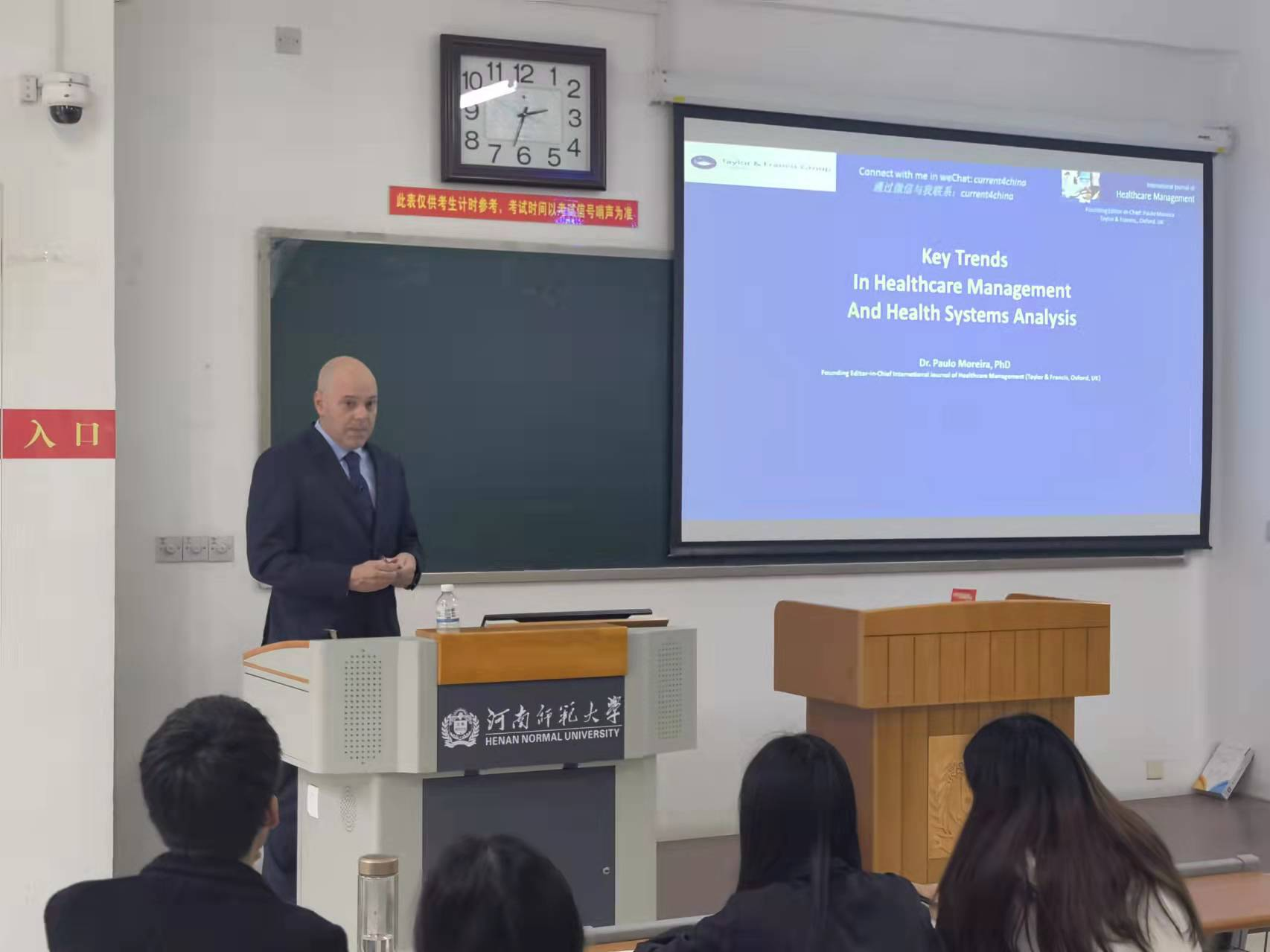 2021年秋季学期,我院在河南省高端外国专家项目的支持下,立足新时代,回应新需求,积极推进探索新文科建设。邀请葡萄牙大西洋大学健康管理中心主任、英国牛津泰勒和弗朗西斯出版社的IJHM期刊主编莫保罗(Paulo Moreira)教授来我院为19级本科生授课。
