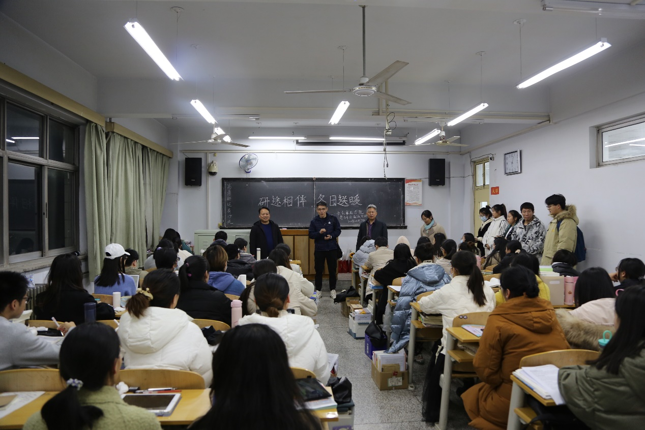 瞿洪明亲切问候考研学子,叮嘱同学们要注意劳逸结合,保持身体健康,并对同学们认真备考的状态表示肯定和赞许,希望他们在冲刺阶段咬紧牙关,坚守初心、全力拼搏、不留遗憾。魏雷东则鼓励学生要保持良好的精神状态,一鼓作气,积极备考,及时与学院和老师沟通交流,缓解焦虑。院党委副书记林安春预祝同学们心想事成,金榜题名。随后,学院教师将精心准备、带有美好寓意的考研大礼包分发给考研学生,为他们送去真诚的祝福。同学们深受鼓舞,表示一定不会辜负学院期望,竭尽全力备考。