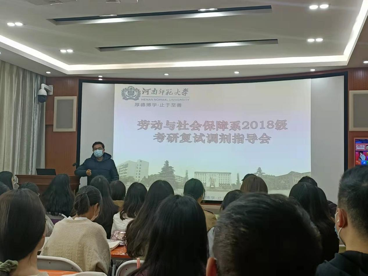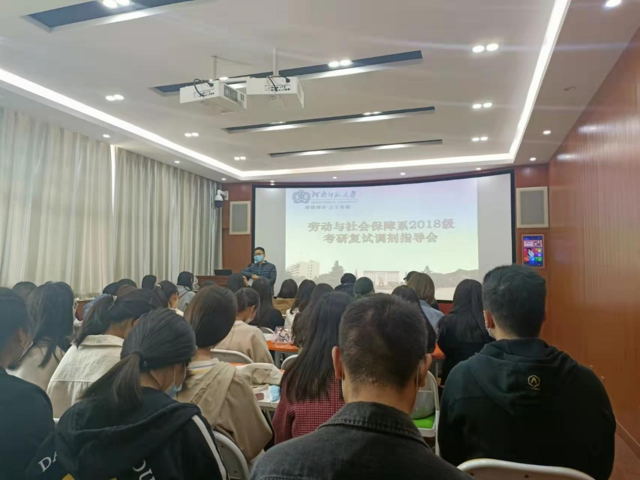 为扎实做好学生的精准指导和服务工作,帮助我院考研学生进一步熟悉考研复试流程与技巧,4月1日上午,劳动与社会保障系在崇智楼503室举办2018级学生考研复试调剂指导交流会。副院长海龙、劳动与社会保障系部分教师及2018级全体学生参加了此次活动。活动由劳动与社会保障系系主任薛君老师主持。