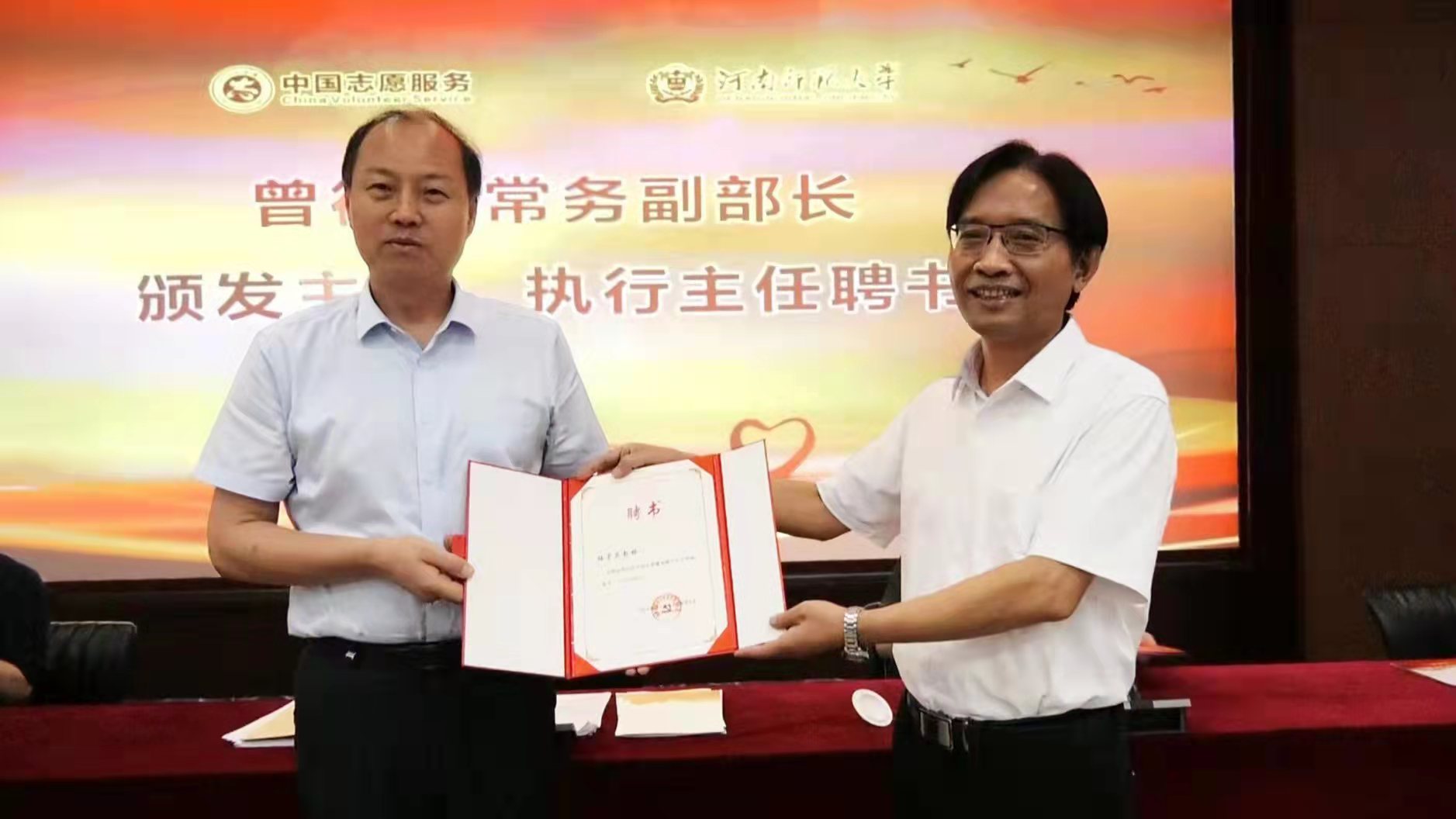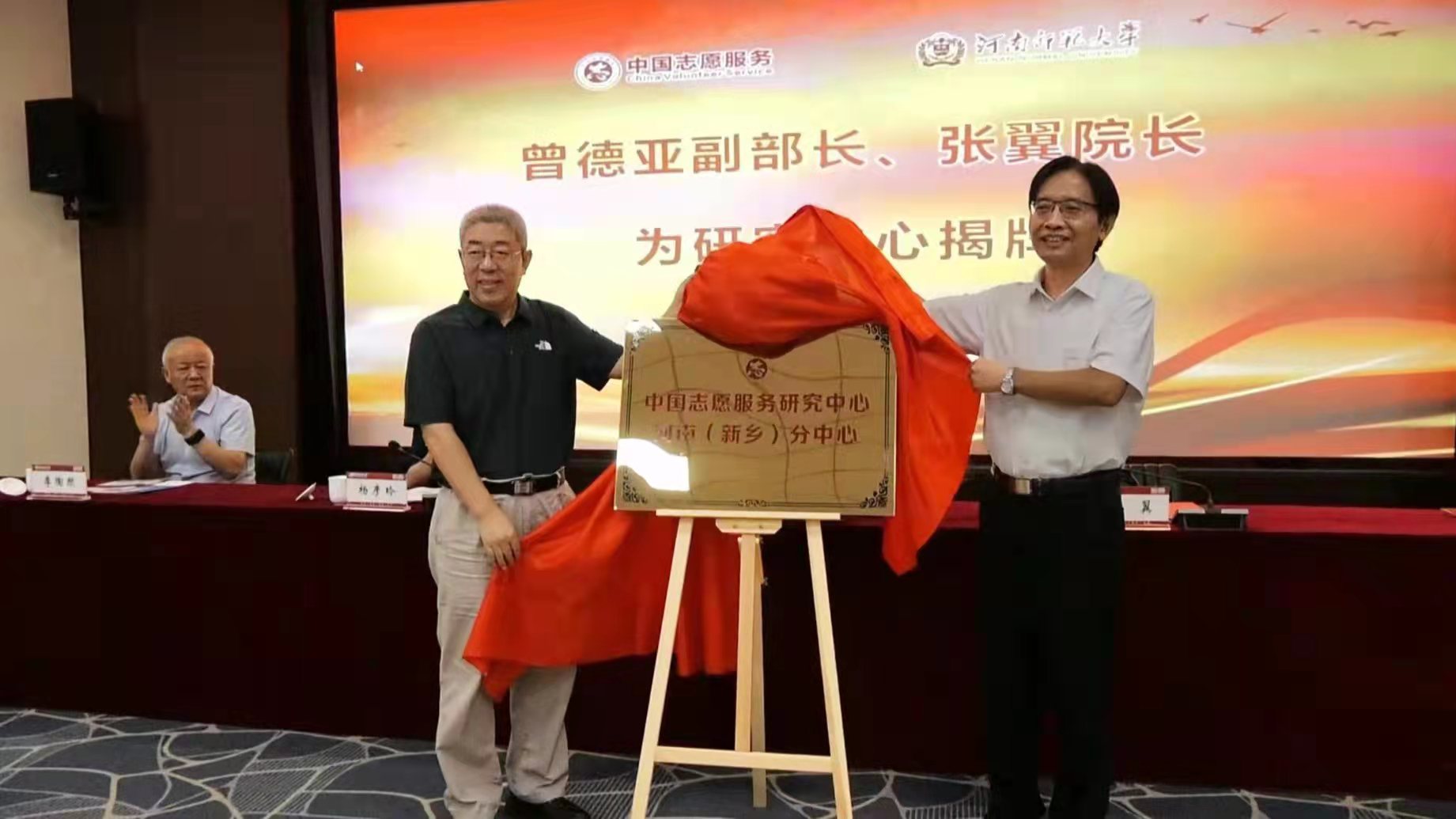 仪式上,曾德亚为张翼颁发河南(新乡)分中心主任聘书,为梅宪宾颁发执行主任聘书。在热烈的掌声中,曾德亚和张翼为中国志愿服务研究中心河南(新乡)分中心揭牌。