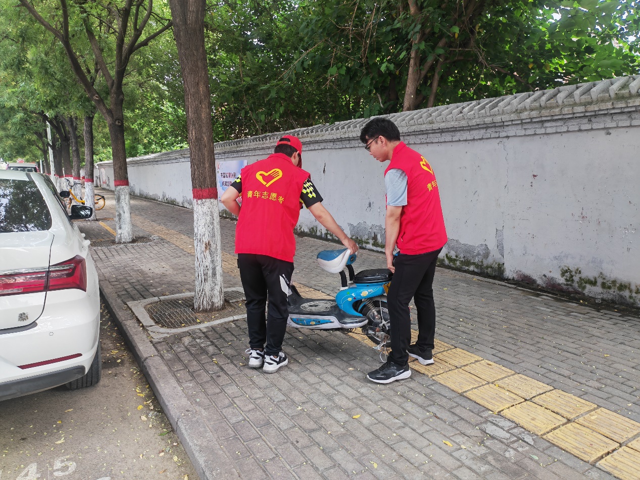 学院志愿者上午10:30到岗,下午14:30结束。志愿者对所在路段开展清扫工作,重点清理路面上的果皮、饭菜、纸屑、垃圾袋等杂物。同时将占用盲道的共享单车、非机动车整齐摆放,并认真劝导十字路口行人和非机动车遵守交通秩序、文明礼让。