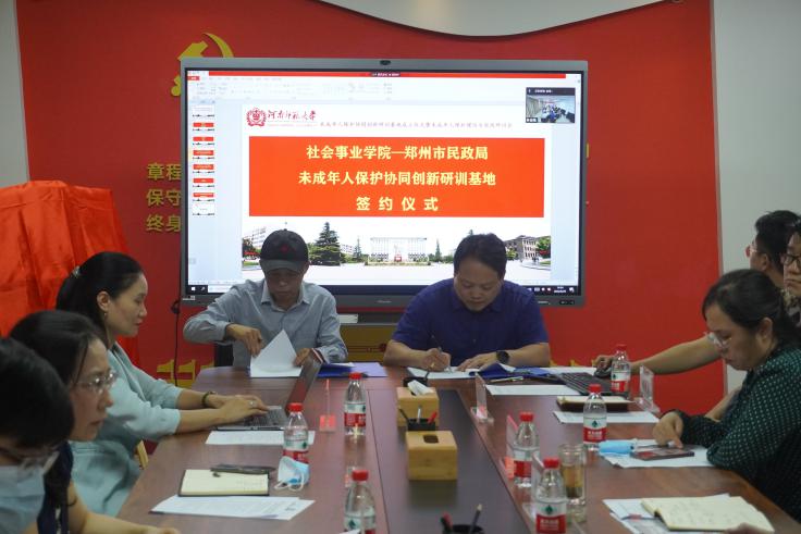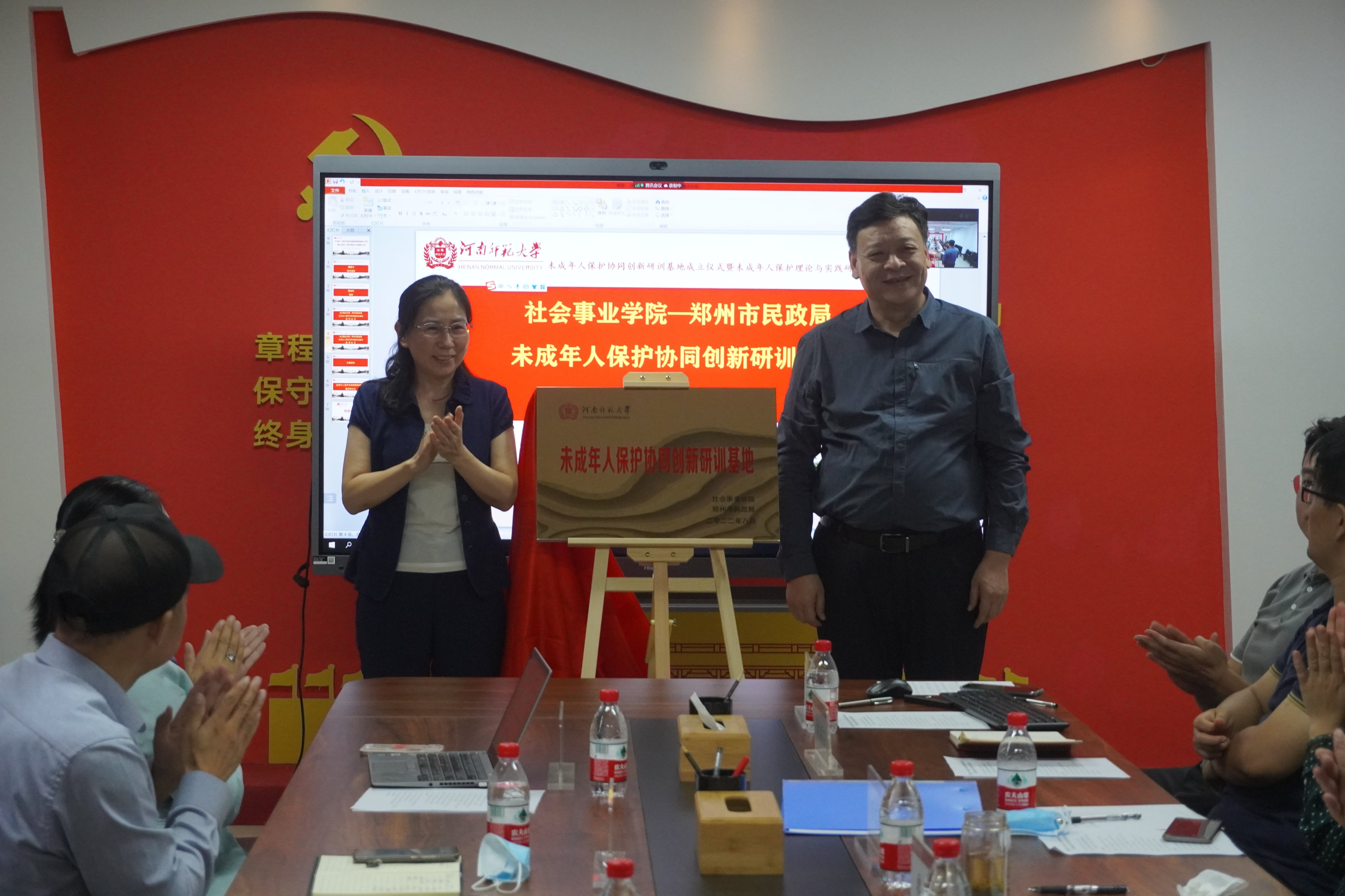 紧接着,在线上和线下与会嘉宾的共同见证下,双方进行了隆重的签约和揭牌仪式,标志着伟德官网下载苹果版社会事业学院——郑州市民政局“未成年人保护协同创新研训基地”的正式成立。