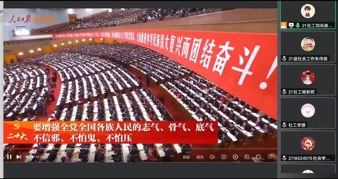 其中,学院2021级社会学班团支部书记周思一带领全体同学深入学习党的二十大的深刻意义和重要地位,同时围绕“举什么旗、走什么路、以什么样的精神状态、朝着什么样的目标继续前进”等方面进行分享阐述,引导与会同学深入学习党的二十大精神。与会青年学生通过线上发言、线下讨论的形式分享交流自己关于党的二十大的深刻感悟;大家纷纷表示要深入学习贯彻习近平新时代中国特色社会主义思想,广博汲取学科营养,为实现中华民族伟大复兴的中国梦贡献自己的青春力量。