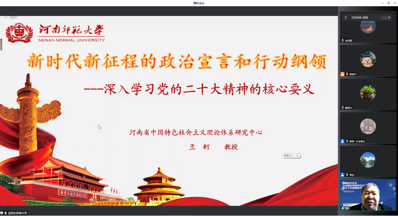 12月17日,社会事业学院召开学习党的二十大精神宣讲报告会,河南省中国特色社会主义理论体系研究中心孟轲教授以《新时代新征程的政治宣言和行动纲领》为题,为学院师生作学习党的二十大精神宣讲报告。本次宣讲会以线上形式开展,会议由院长魏雷东主持。