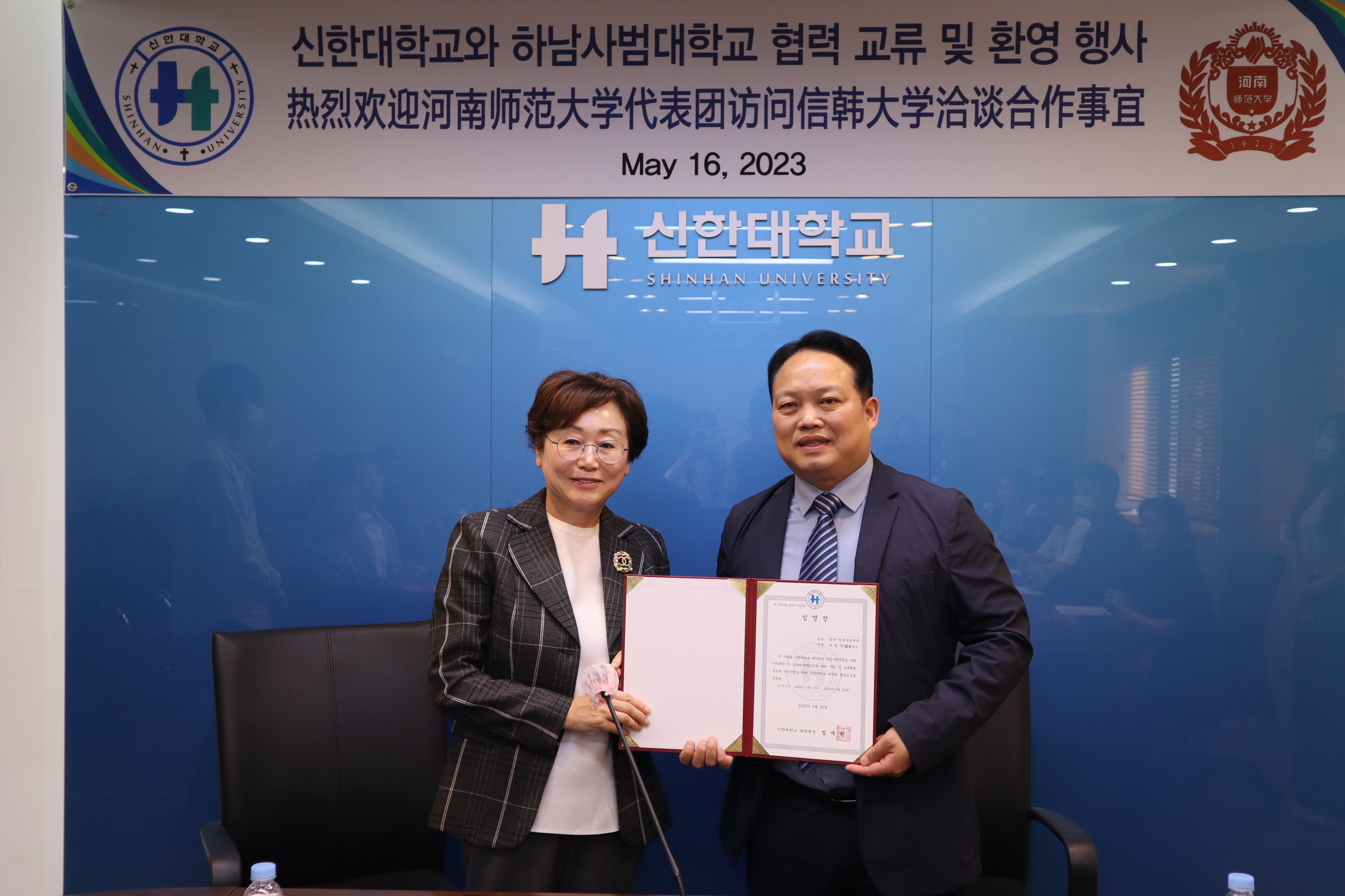 信韩大学大学院与伟德官网下载苹果版社会事业学院就共建社会福利学科达成共识,举行合作签约和聘任仪式。林爱莲院长与魏雷东院长共同签订《中国伟德官网下载苹果版社会事业学院与韩国信韩大学大学院合作交流协议书》,并向魏雷东院长颁发合作教授聘书。信韩大学国际交流处为代表团举行短期研修结业仪式,为师生颁发研修结业证书。三所高校社会福利学系知名教授向学院赠送各自最新出版的学术专著和精选教材,并就国际一流师资互聘进行磋商。代表团举行专场博士招聘会介绍学校优秀博士人才引进政策,并与在韩博士留学生进行交流座谈。