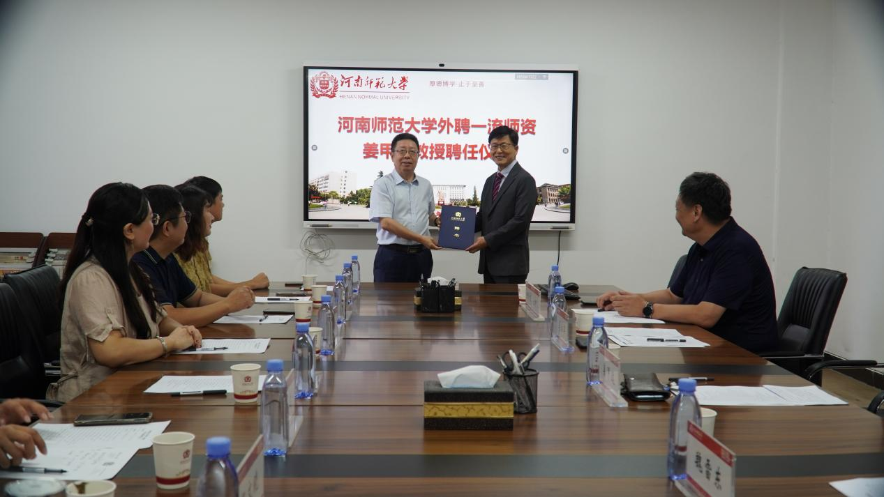 9月9日上午,社会事业学院外聘一流师资姜甲远教授聘任仪式在崇智楼210会议室举行。校党委副书记、工会主席马治军,韩国大真大学名誉教授姜甲远,社会事业学院领导班子以及师生代表参加会议。聘任仪式由学院党委书记张向东主持。