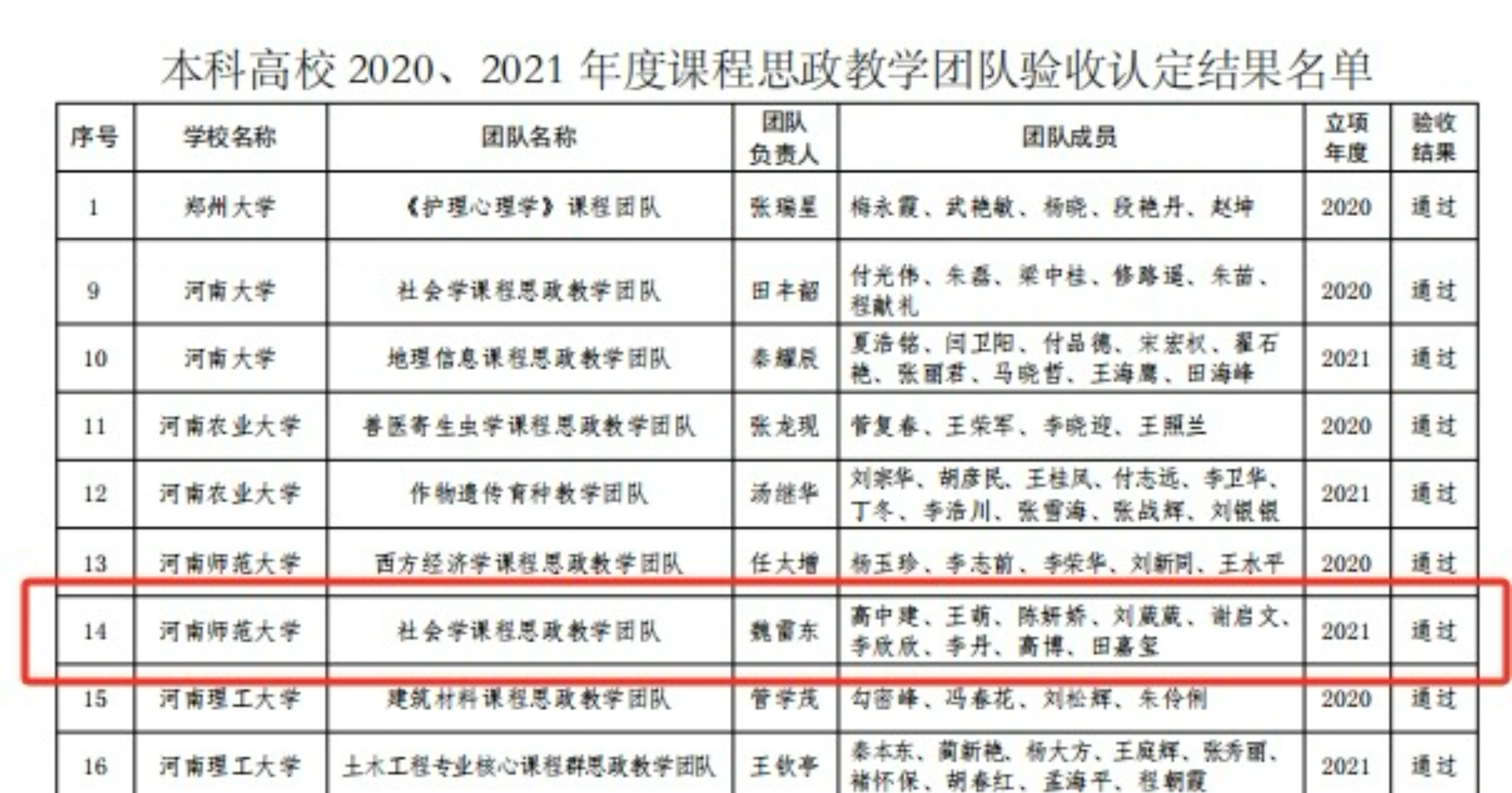 近日,河南省教育厅公布了《河南省本科高校2023年课程思政项目建设名单和2020、2021年度立项项目验收认定结果名单的通知》,我院“社会学课程思政教学团队”顺利通过教学团队验收。