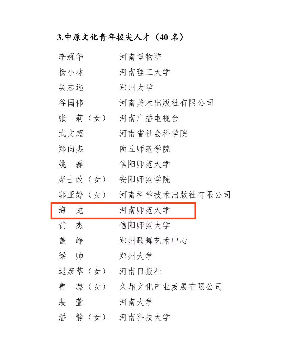 近日,中共河南省委人才工作领导小组办公室发布了2023年度“中原英才计划(育才系列)”拟入选人员公示名单,确定拟入选2023年度“中原英才计划(育才系列)”人选。我校共6人入选,社会事业学院副院长海龙为我校唯一入选“中原文化青年拔尖人才”。