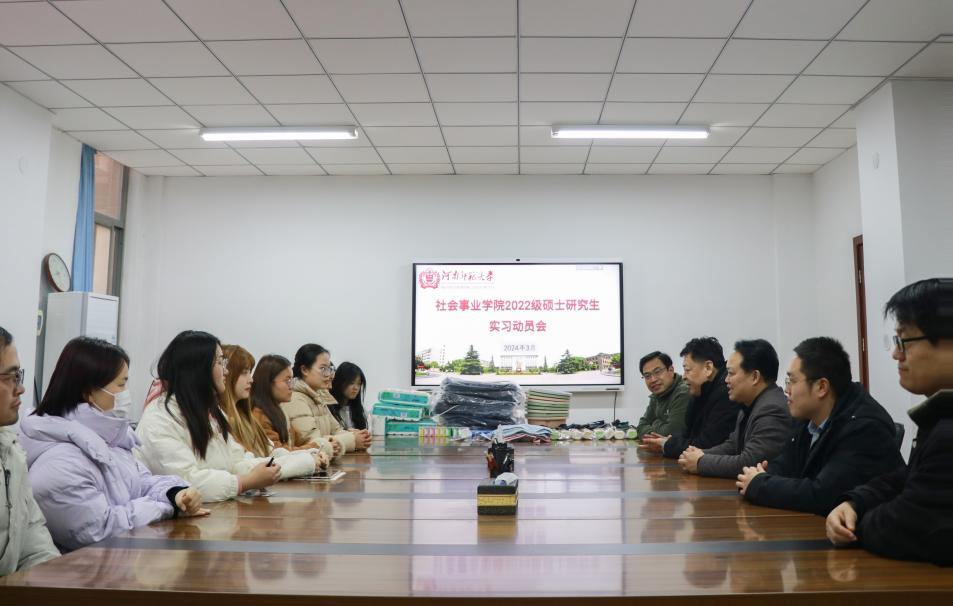 为进一步提升学院专业硕士实习效果,鼓励实习研究生发挥专业特长、投身专业实践,3月6日下午,社会事业学院于崇智楼210会议室召开社会工作专业硕士研究生实习动员会,社会事业学院党委书记张向东、院长魏雷东、副院长海龙、实习指导教师谢启文、宋长慧,研究生辅导员代梦缘以及9名即将赴河南省直第三人民医院的社会工作专业硕士研究生参会。