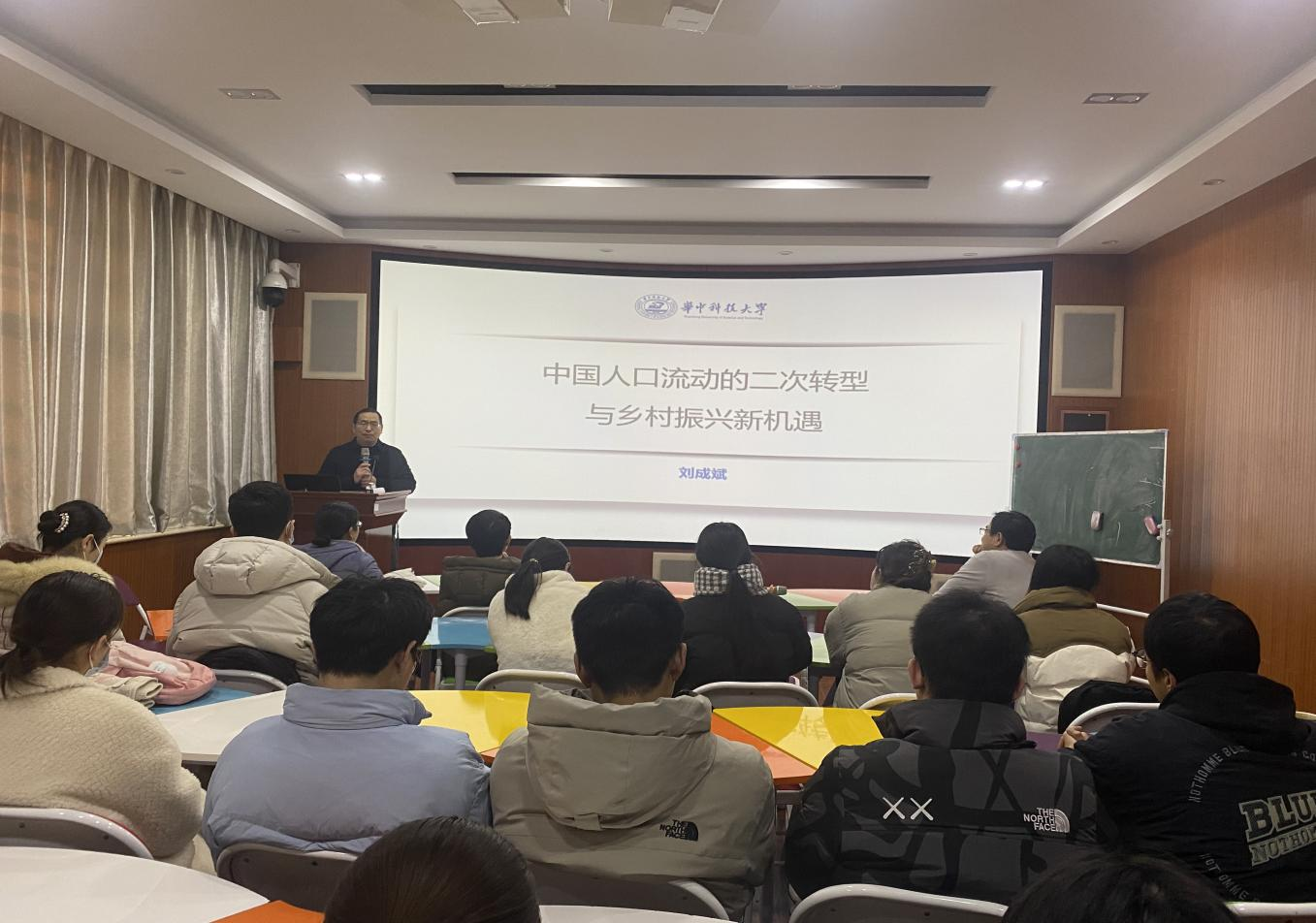 1月12日上午,华中科技大学社会学院副院长刘成斌教授莅临我院讲学。讲座以“人口流动的二次转型与乡村振兴新机遇”为题,讲述了人口流动的二次转型源起及其带来的一系列机遇与挑战。讲座由副院长海龙主持。