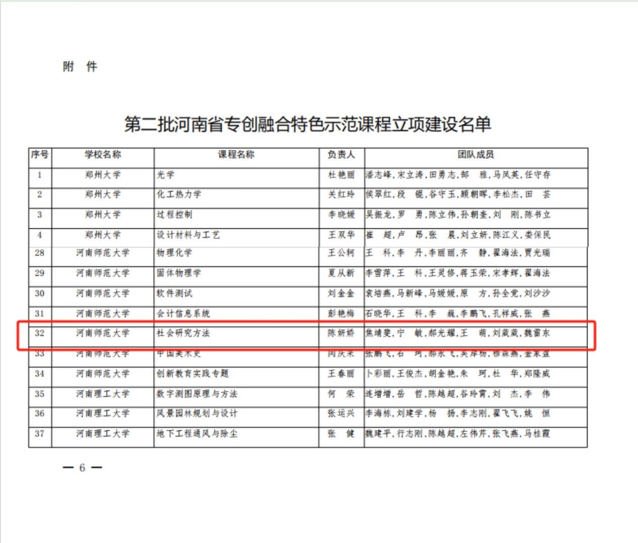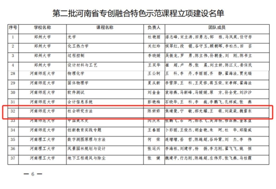 近日,河南省教育厅办公室公布了第二批河南省“专创融合”特色示范课程立项建设名单,学院教学院长陈妍娇申报的《社会研究方法》课程成功入选,成为本校获批的七门课程之一。
