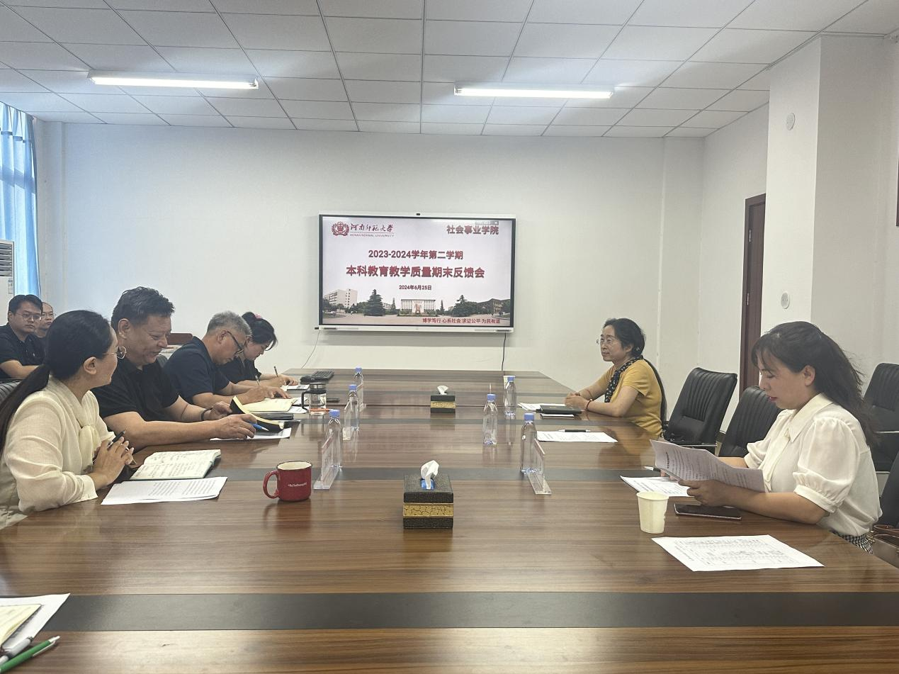 6月25日下午,社会事业学院2023-2024学年第二学期本科教育教学质量期末反馈会于崇智楼210会议室顺利召开。校文科督导组组长督导周芳、督导老师王海琴、学院领导班子成员、学院同行督导及全体教师出席。会议由副院长陈妍娇主持。