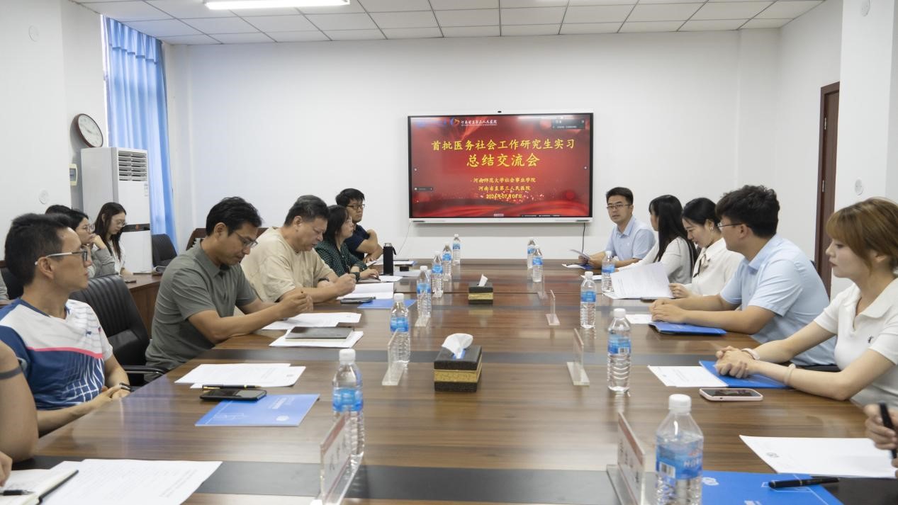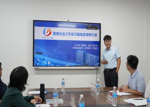 7月1日上午,由伟德官网下载苹果版社会事业学院与河南省直第三人民医院(以下简称“省直三院”)联合培养的首批医务社会工作研究生顺利返校,并在社会事业学院210会议室召开实习总结交流会。河南省直第三人民医院护理部副主任王东阳、护理部副主任李盟、医务社工教研室教研干事杨行受邀出席本次会议,社会事业学院党委书记张向东、副院长海龙、社会工作系主任纪文晓、研究生工作秘书薛君、研究生实习指导教师谢启文、实习指导教师宋长慧、研究生辅导员代梦缘出席会议,实习研究生代表与2023级社会工作专业全体研究生参会。
