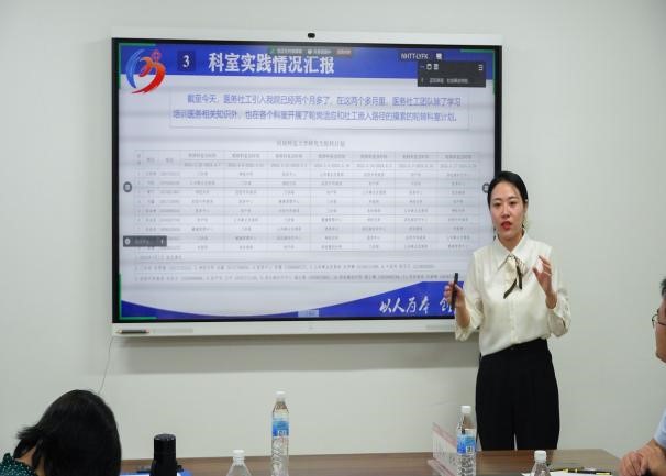 实习学生代表刘轶、岳金星分别详细汇报了他们在实习期间的工作内容与收获,包括参与患者心理疏导、协调医患关系、参与志愿服务活动等方面的实践,讲述了他们在医务社工如何运用专业知识和技能为患者提供全方位的支持和帮助这条路上的探索。刘轶表示,从医务知识培训到科室轮转和定岗,再到定岗后在所从事工作领域的学习和深挖,实现了从一名社会工作研究生到一名准医务社会工作者的有机转变,课本上的理论知识在这里实现了具象化。岳金星表示,回想实习历程,自己成长了许多,最重要的是极大强化了自己对医务社工的职业认同感,明确了下一步的发展方向。