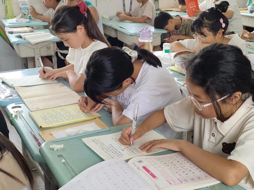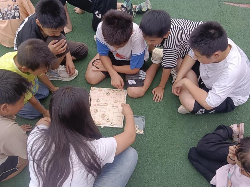书法教室里,一笔一划间尽显汉字文化魅力。在哥哥姐姐的耐心指导下,孩子们提笔端坐,或专注练习三笔字,或凝神观看名家书写视频,时不时还对着视频模仿名家书写,对汉字书法表现出极大的热情和兴趣,和中式美学来了一次近距离接触。体育时间,操场成了欢乐的海洋,象棋的静谧对弈、乒乓球的灵活跳动、羽毛球的轻盈飞舞、足球的团队协作,一系列秒趣横生的文体活动,让孩子们在汗水中收获了友谊与快乐,让他们在记忆中留下了一个美好的夏天。