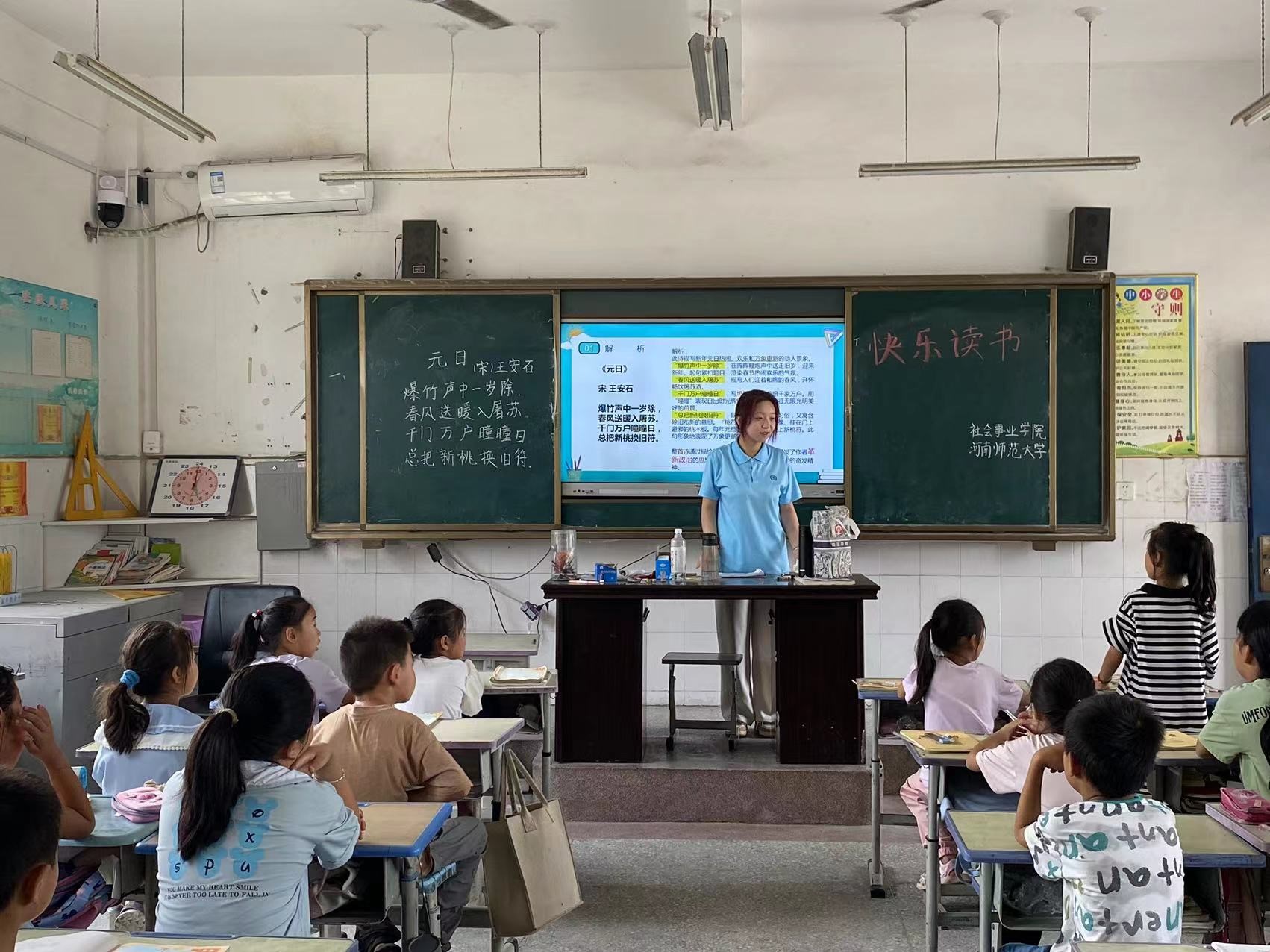 为了让诗词学习变得更加生动有趣,“书香润心·阅读启智”读书小组引入音乐元素,带领学生们开展读背诗词(音乐唱诗词)活动。实践队员选取了几首经典诗词,配以悠扬的旋律,引导孩子们在音乐的伴奏下朗读并尝试演唱。此外,读书小组带领学生们进行了童话故事讲述活动。他们精选了多个富有教育意义的童话故事,通过生动的讲述,让孩子们沉浸其中,带领孩子们走进一个又一个奇妙的世界。