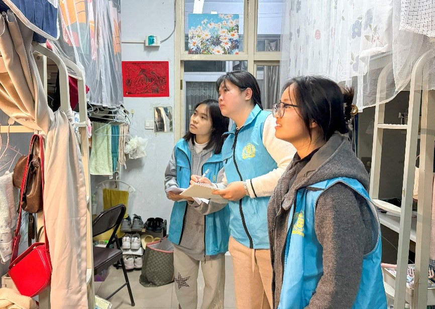 针对学生宿舍隐患,楼管会成员联合各学院主要学生干部开展专项安全排查。活动前,学院党委副书记、社区楼长林安春强调,楼管会全体成员要文明检查,绝不擅自翻动私人物品,确保检查过程规范有序。随后楼管会按照工作要求,对违禁电器使用、电动车电池入户充电等重大隐患开展入户排查,同时对社区各类公共设施的完备性进行登记,将排查情况进行汇总和反馈。