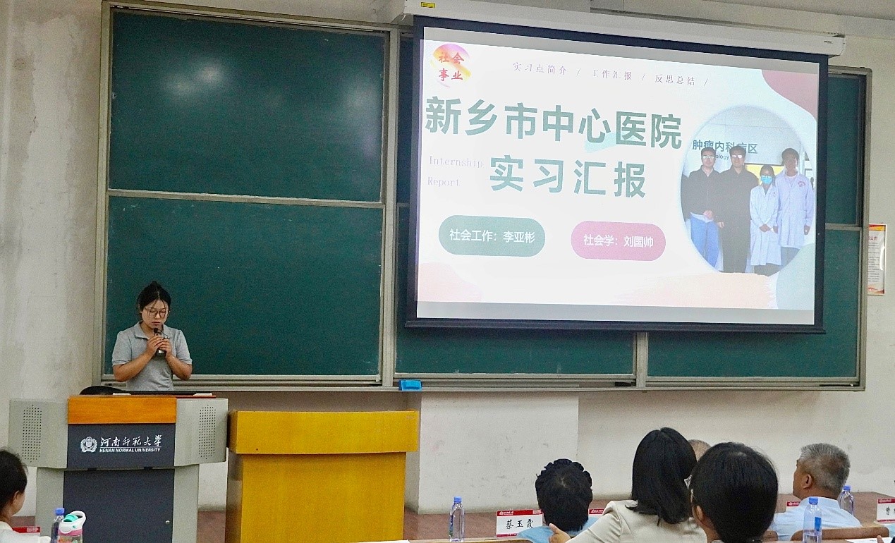 在分组汇报环节,19组实习生代表逐一总结汇报,畅谈在不同实习岗位上的收获与感悟。汇报现场,他们分享的内容分布在多个行业:从新乡市中心医院肿瘤科的病房,到郑州市儿童福利院的温馨角落;从社区矫正工作的前沿阵地,到基础教育领域的三尺讲台。同学们借助一个个鲜活真实的案例,将医疗、司法、教育、社工等领域的实践经历娓娓道来。其中,新乡市中心医院实习生李亚彬,分享了参与“安宁疗护”项目时的动人故事。在那段充满温情与挑战的日子里,她以细腻的讲述勾勒出医务社会工作者的专业素养与人文关怀,令人动容。而新乡市青少年活动中心的张晓晴,则通过深入剖析实习案例,生动展现了实习经历对个人成长与发展的深远影响。这一场场精彩的汇报,淋漓尽致地彰显了社会事业学院学生扎根基层、服务社会的强烈责任感与使命感,他们用实际行动诠释着青春的价值与担当。