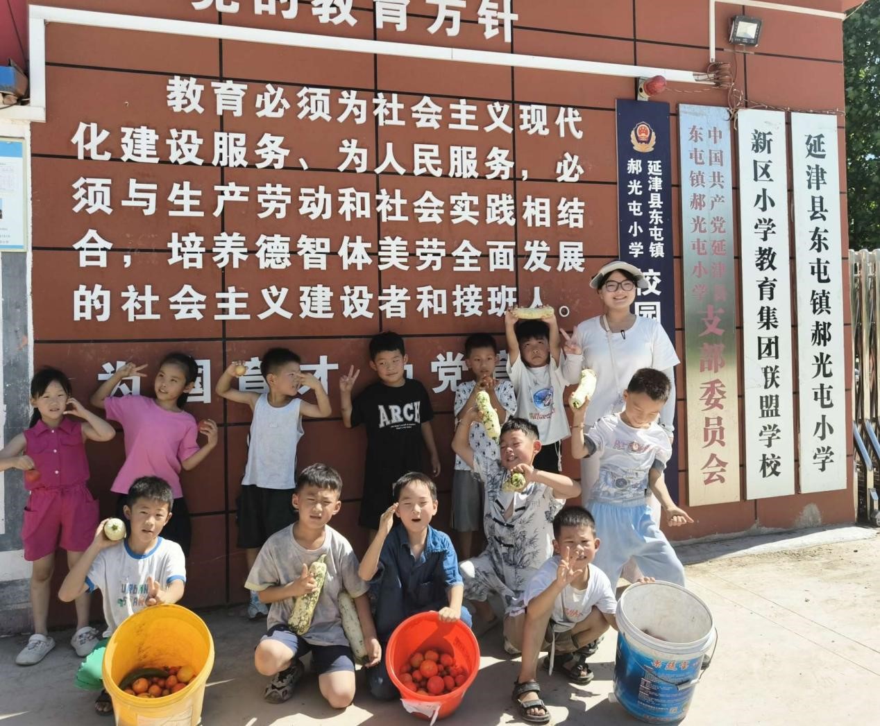 7月7日下午,社会事业学院“爱在农村,绽放希望关爱留守儿童志愿服务团”的实践队员们带领郝光屯小学的孩子们前往校园菜园,开展蔬菜采摘实践活动,为孩子们的暑期生活添上一抹别样色彩。