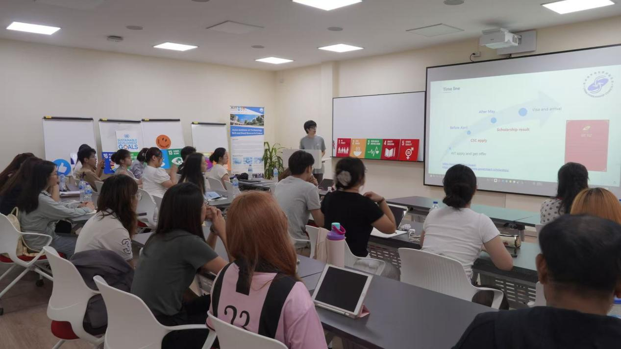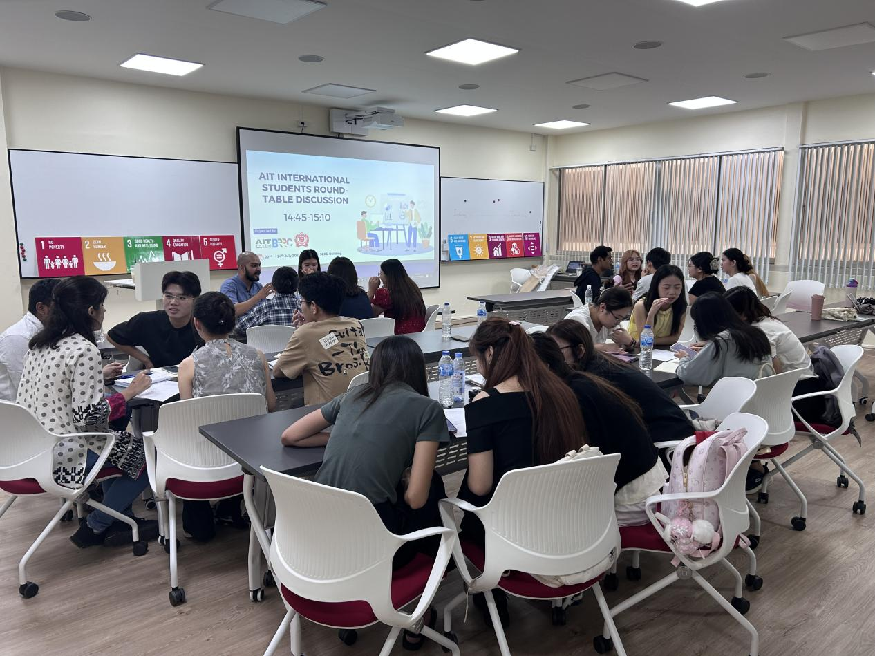 亚理工的在读博士生何一凡、Krishna Prakash及硕士生Yamin Thu分享了在国际学术环境中的学习、科研及奖学金申请经验,为学生提供了实用的留学参考。随后的“国际学生圆桌论坛”上,来自泰国、印度、孟加拉国、缅甸等国的亚理工学生代表与研学团学生围绕“文化多样性”“本国可持续发展挑战”等话题开展交流。研学团学生们分享了家乡在生态保护、乡村建设中的实践,亚洲理工的学生代表们则介绍了东南亚国家在应对城市化、资源短缺中的探索,不同视角的碰撞让现场气氛十分热烈。