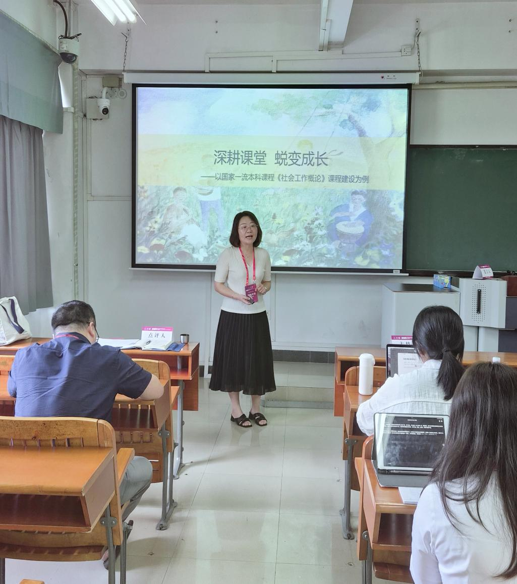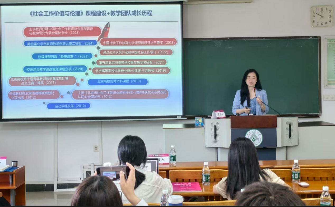 北京城市学院林霞教授作《<社会工作价值与伦理>课程“问题链驱动下进阶式混合教学”创新与实践》主题发言。林老师提出了“学生为本、行标为基、共同进阶”的创新理念,通过对课程“问题链”的设计,即课前激发学习动力、课中引导深度学习、课后巩固延展提升,进而帮助学生实现从理论认知到伦理判断能力提升的跃升,取得了显著的育人效果。