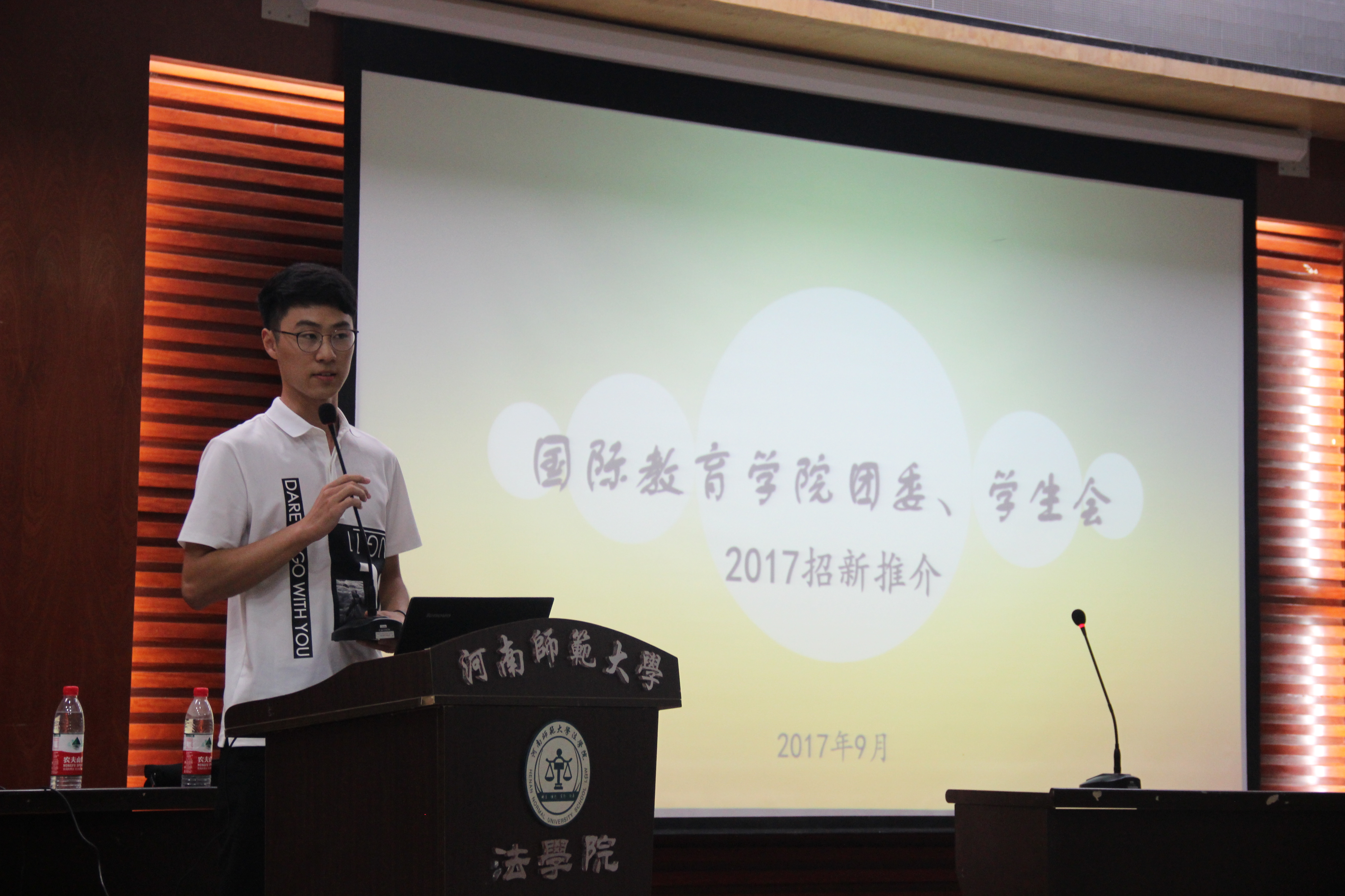 9月15日晚,由国际教育学院团委、学生会主办的2017年招新推介会在模拟法庭举行。此次会议由团委、学生会全体成员和2017级全体新生共同参与。会议由学生会主席付晗茜主持。