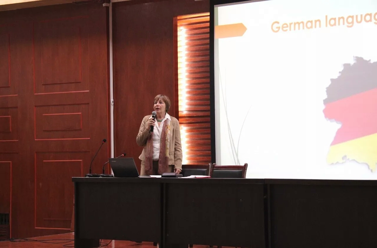 吉塞拉·格雷泽尔·古斯曼(Gisela Graeser-Güsmann)女士以德语语言与文化简介为主题,首先从不同方面介绍了德国的地形、历史、著名城市和建筑,描述了德国的经济科技发展状况,让在场师生对德国有了初步的了解。同时,古斯曼女士从饮食、出行方式、住房习惯、作息时间、家庭组成等部分,详细介绍了德国人的日常生活,带大家共同领略了德国的风土人情。接着,古斯曼女士讲解了德国思想家、哲学家康德和歌德等人在德国文化方面作出的贡献,勾起了同学们学习德国文化的浓厚兴趣。最后,古斯曼女士就白丽书记提出的德国作为法国人的邻居,对于学法语有何建议的问题,做出了详细解答。古斯曼女士指出学好法语,一定要找到志趣相投的伙伴一起学习,懂得利用网上丰富的学习资源。