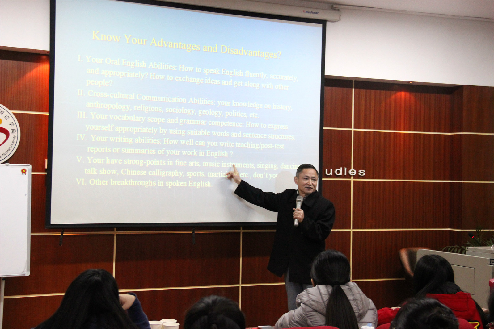 首先陈运香院长在讲座开始前向在座各位简单介绍了我院志愿者培训、外派情况以及考试大致的流程环节,接着,郑州大学国际教育学院宋海燕老师以“汉语语言要素与国际汉语教学”为题,通过汉语教学的基础知识及国际汉语的教学方法使在座同学加深了对汉语知识与技巧的了解;刘江静老师以“‘泰’幸福”为题的讲座介绍了一些泰国的风土人情和汉语教师志愿者由于文化差异而需注意的事项;端木庆一教授以“Basic Requirement of Oral English Abilities——for future Chinese Volunteer”为讲题开启了讲座,端木教授从考官的角度讲述了如何面对英语考试以及面试时能的高分的妙招并耐心解答了同学们的疑惑。“瀚宇之花盛开——考试技巧及跨文化交际策略”的主讲人外语学院李美艳老师以考生的角度,用自身经历为我们带来了精彩实用的讲座,包括被顺利派出的要求、注意事项和考试内容、流程及实用对应技巧。最后陈运香院长作了总结与补充,提炼了要点,特别向同学们强调了考试面试时的注意事项。