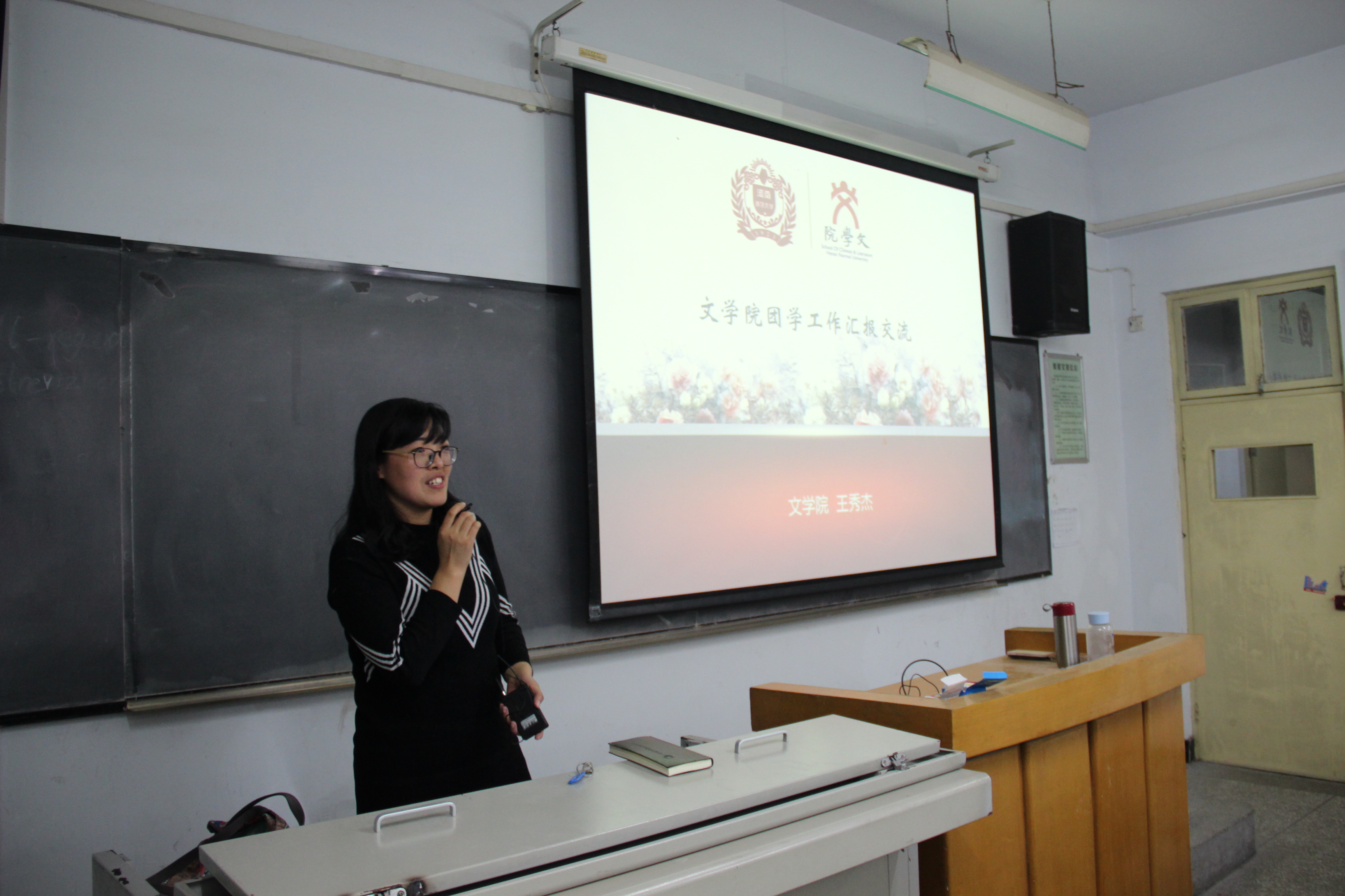 首先,我院团委书记韩舒老师致开场辞。然后,王老师就“三素质——学生干部要有鲜明的角色意识、增强自身学习能力及执行能力”三方面介绍了文学院的学生工作。她强调,学生干部首先要明确所在部门工作,更重要的是要有良好的学习能力。以综合测评为例,通过综合测评可以检验学生的人际交往能力,从而能够更好的树立合作意识,实现部门间的团结协作。