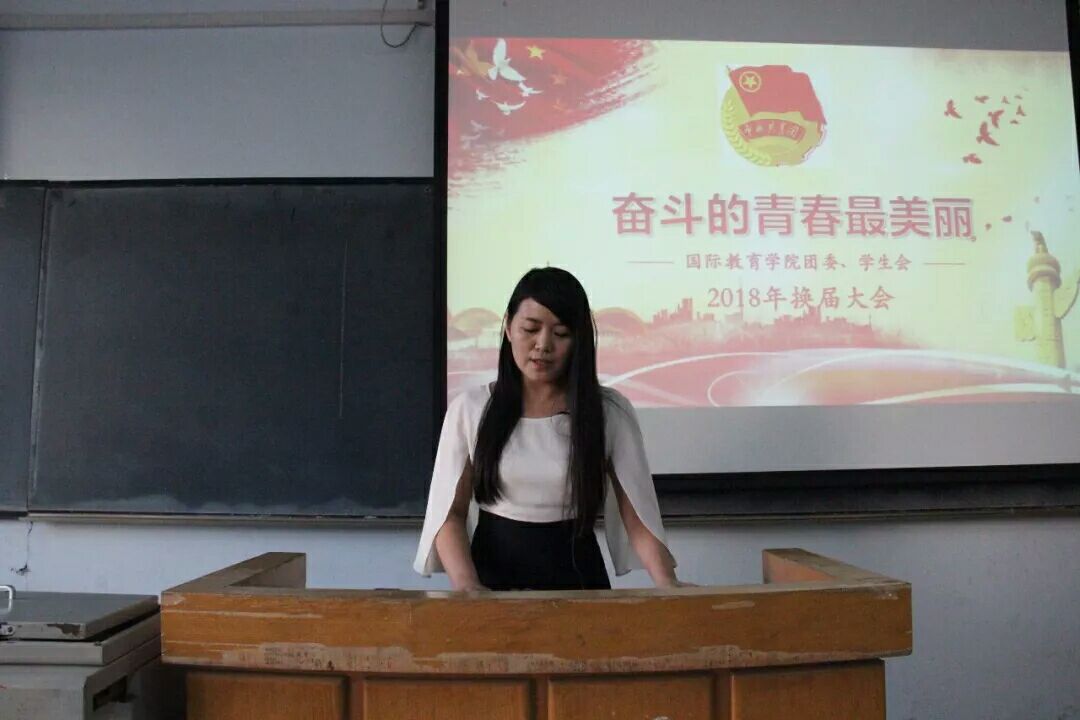 大会在充满青春活力的团歌中拉开序幕。韩舒发言充分肯定了第六届团委、学生会的工作成果,并以“完善学生体系,发出国教声音”高度评价了学院一年以来的团学工作。接下来,韩舒宣读了换届结果,并向下一届团委、学生会成员表达出自己的期望。前任学生会主席付晗茜和团委副书记郭世航分别发言,他们强调了国教学生干部:服务学院,团结奉献的精神,总结了在任时的工作经验,勉励下一届团委、学生会成员拧在一起,聚在一起,让国教团学工作再上一层楼。新任学生会主席丁文博和团委副书记方颀卓发言,他们表示“上面千条线,下面一根针”,要以身作则,团结一致,和大家携手共建美好国教。随后,第七届全体团委、学生会成员作入职宣誓。