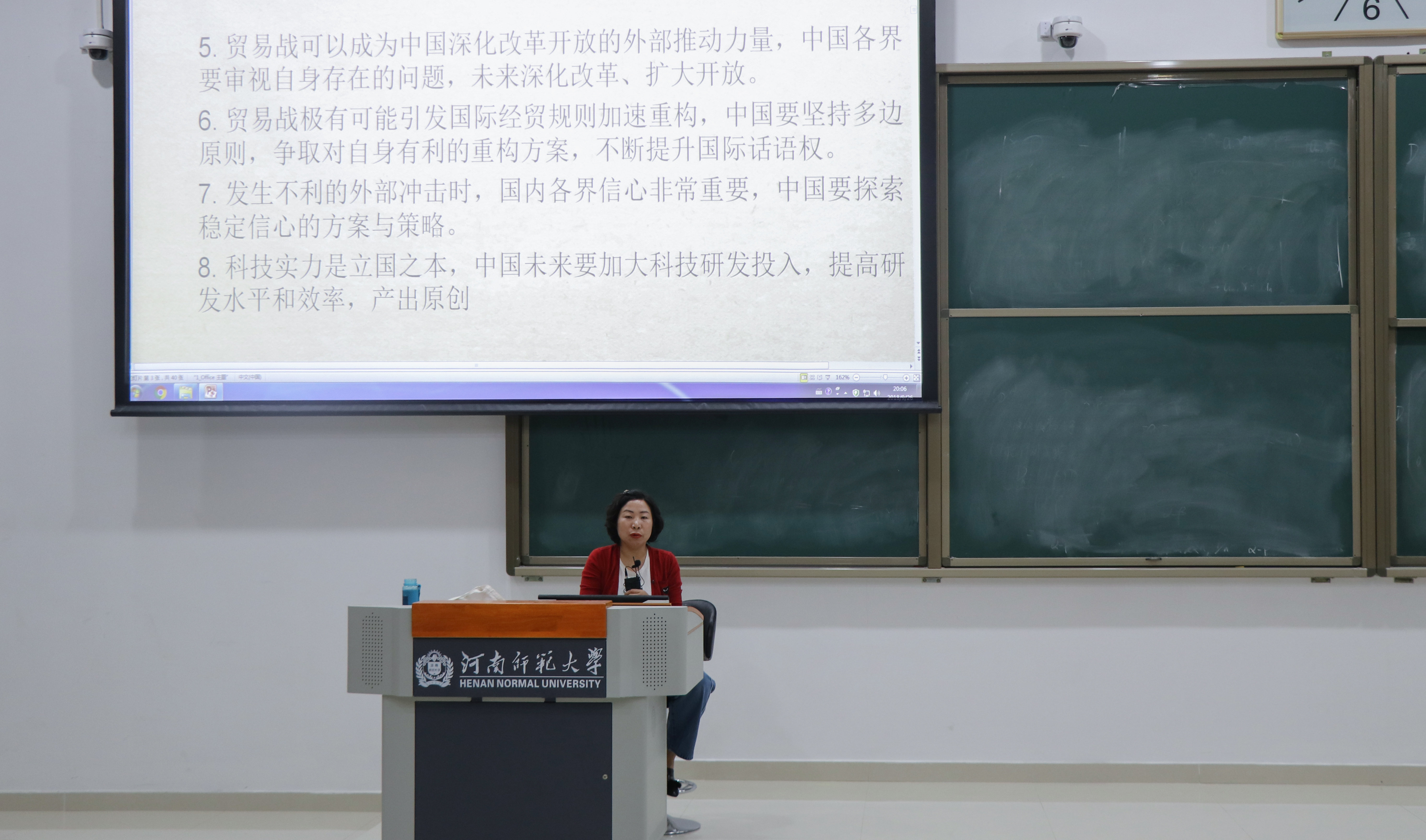 会议伊始,李金华老师提出中美经贸摩擦是当今社会的热点问题,中美经贸摩擦对中美两国乃至全世界的发展造成了巨大的危害。会上,李老师给出了“中美经贸摩擦产生的部分原因是两国价值观存在一定差异”的观点。并提出中美经贸摩擦存在持久性的特点,要防止中美经贸摩擦的升级。讲座接近尾声,李老师做出小结:中美冲突的核心焦点是美国对中国发展模式的不认同。中国在应对中美经贸摩擦的过程中要本着“坚守底线、消除误解、正视问题的原则,并且依旧需要继续增强我国的经济实力和综合国力。