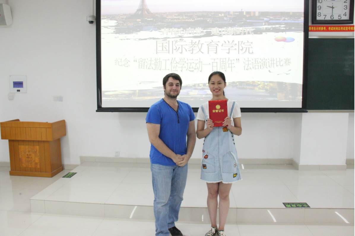 春山暖日送和风,百年留法启新篇。为纪念五四运动及留法勤工俭学运动100周年,同时进一步丰富校园文化生活,提高同学们学习法语语言文化的热情,5月17日晚,国际教育学院首届法语演讲比赛于东区综合楼104教室举办。本次活动特邀国际教育学院外教Damien、外国语学院马田碧老师及三位学长学姐担任评委。国际教育学院党总支副书记白丽,团委书记韩舒及学院200余名学生到场观赛。