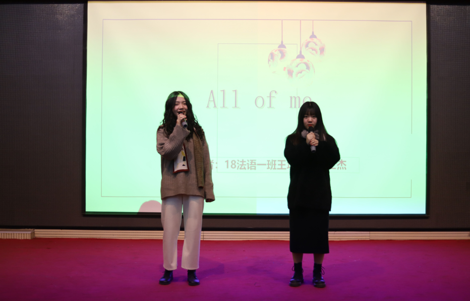 活动伊始,主持人用中法双语介绍出席嘉宾并宣布外文歌曲大赛正式开始。比赛以王怡欣演唱的Dollhouse拉开帷幕,现场气势全开;胡以卓演唱的You are my everything甜蜜而浪漫,给观众带来听觉上的盛宴;曹毓灵演唱的New soul轻快活泼;王晨阳、周雪茹深情合唱法语版《大鱼》,将观众拉入动人故事;柴欣茹演唱的Daylight灵动悦耳;熊乐萌演唱、金子健吉他伴奏的The show展示出两位选手的超强默契;王秀谷演唱的Ma philosophie旋律优雅,声线动人;刘博演唱的Me and my broken heart让观众欣赏到他磁力十足的嗓音;原灵艳演唱的 J’Espère充满对未来的期望;邢璐与金子健共同演唱的Lucky轻快浪漫,博得观众热烈掌声;张白雪用她广阔的音域演绎You belong to me;王世杰、王坤元用她们甜美的嗓音重释All of me。比赛的最后,我院中法合作办学项目法语专业获得全国法语歌曲大赛二等奖的魏华欣同学深情演唱Lady mamalade,她充满力量的歌声与劲爆舞蹈让比赛完美地拉下帷幕。最终,曹毓灵、王怡欣、胡以卓、柴欣茹获得三等奖;王士杰、王坤元、周雪茹、王晨阳、熊乐萌、原灵艳和张白雪获得二等奖、金子健、邢璐、刘博、王秀谷获得一等奖。