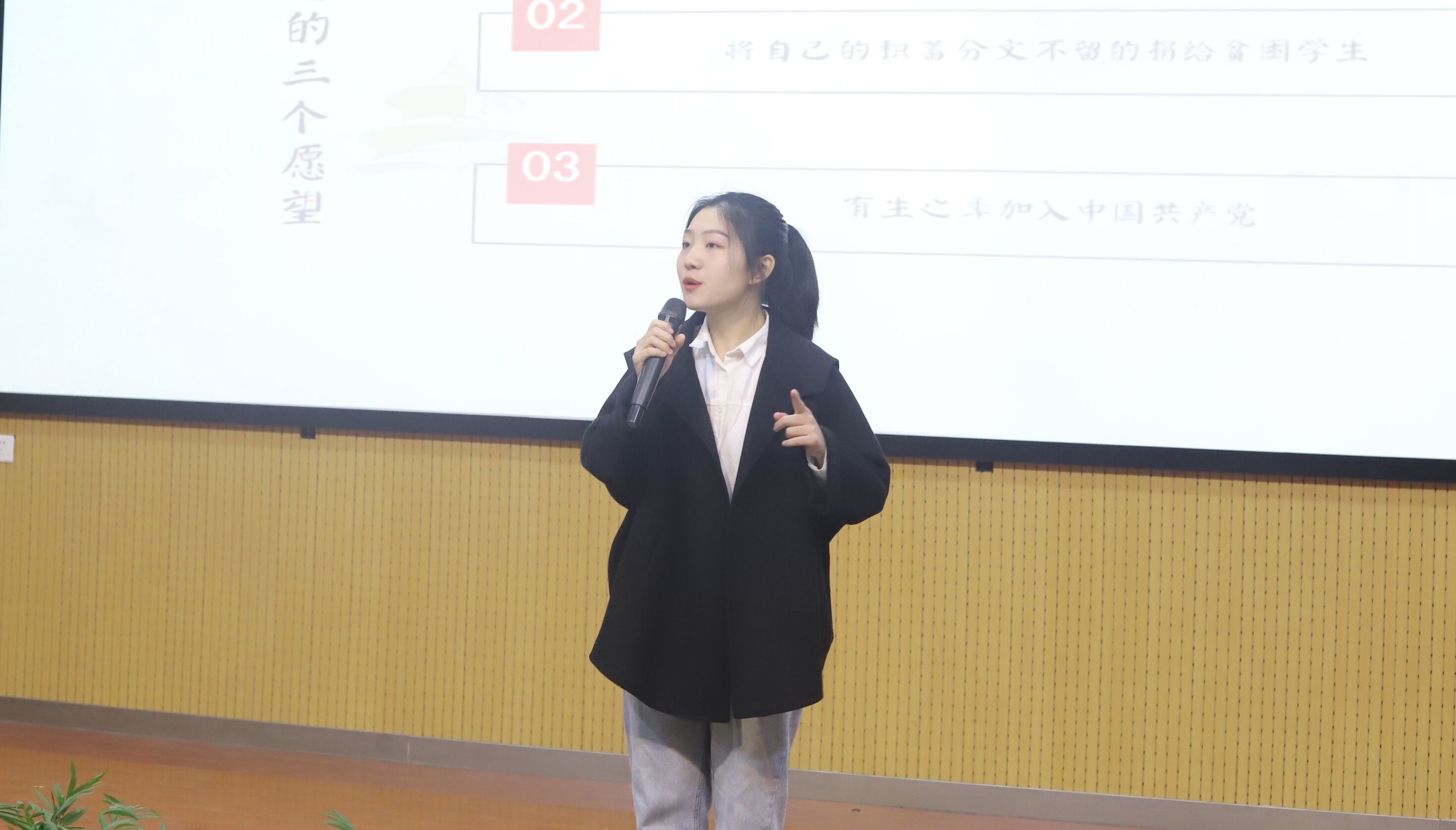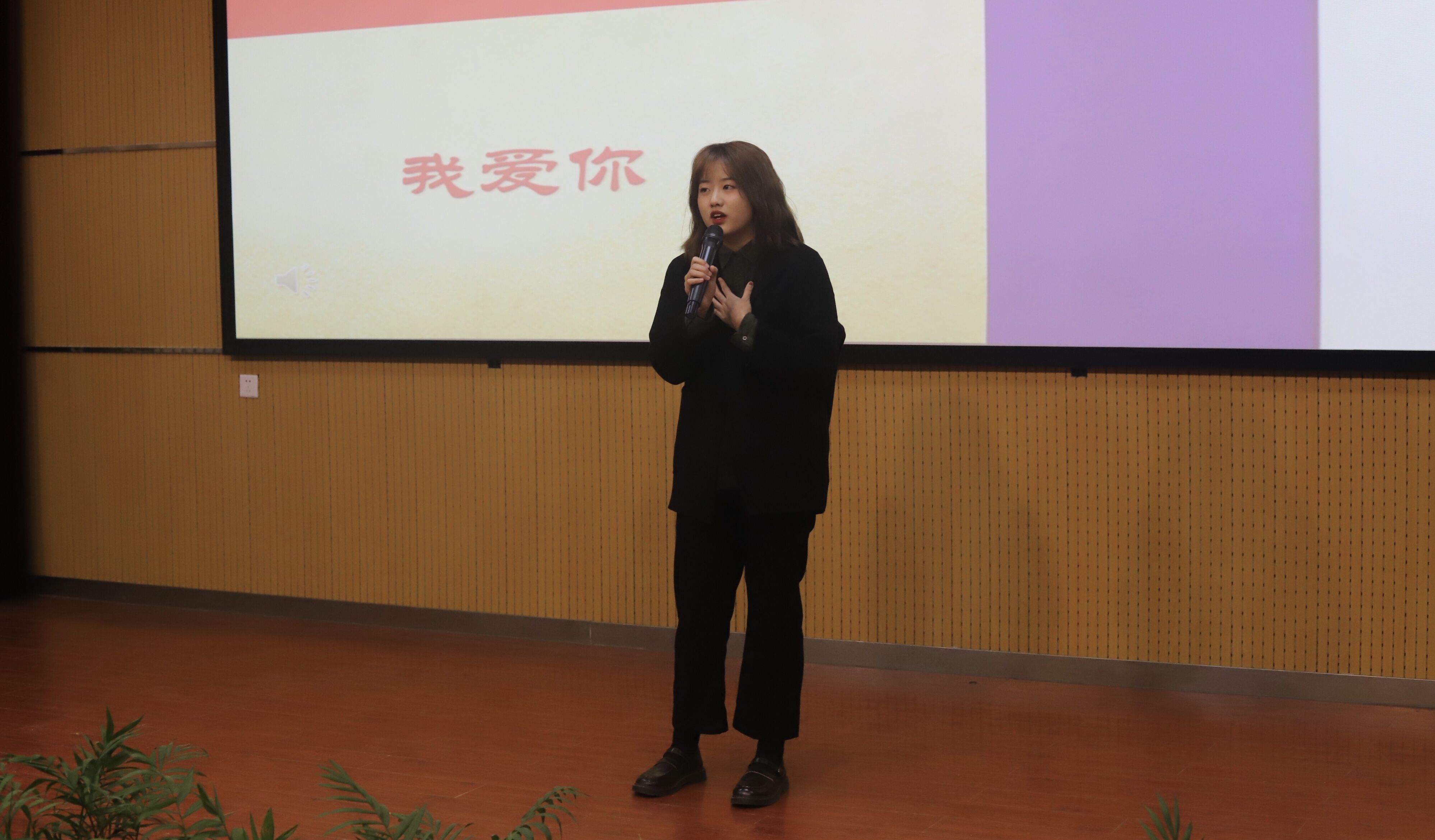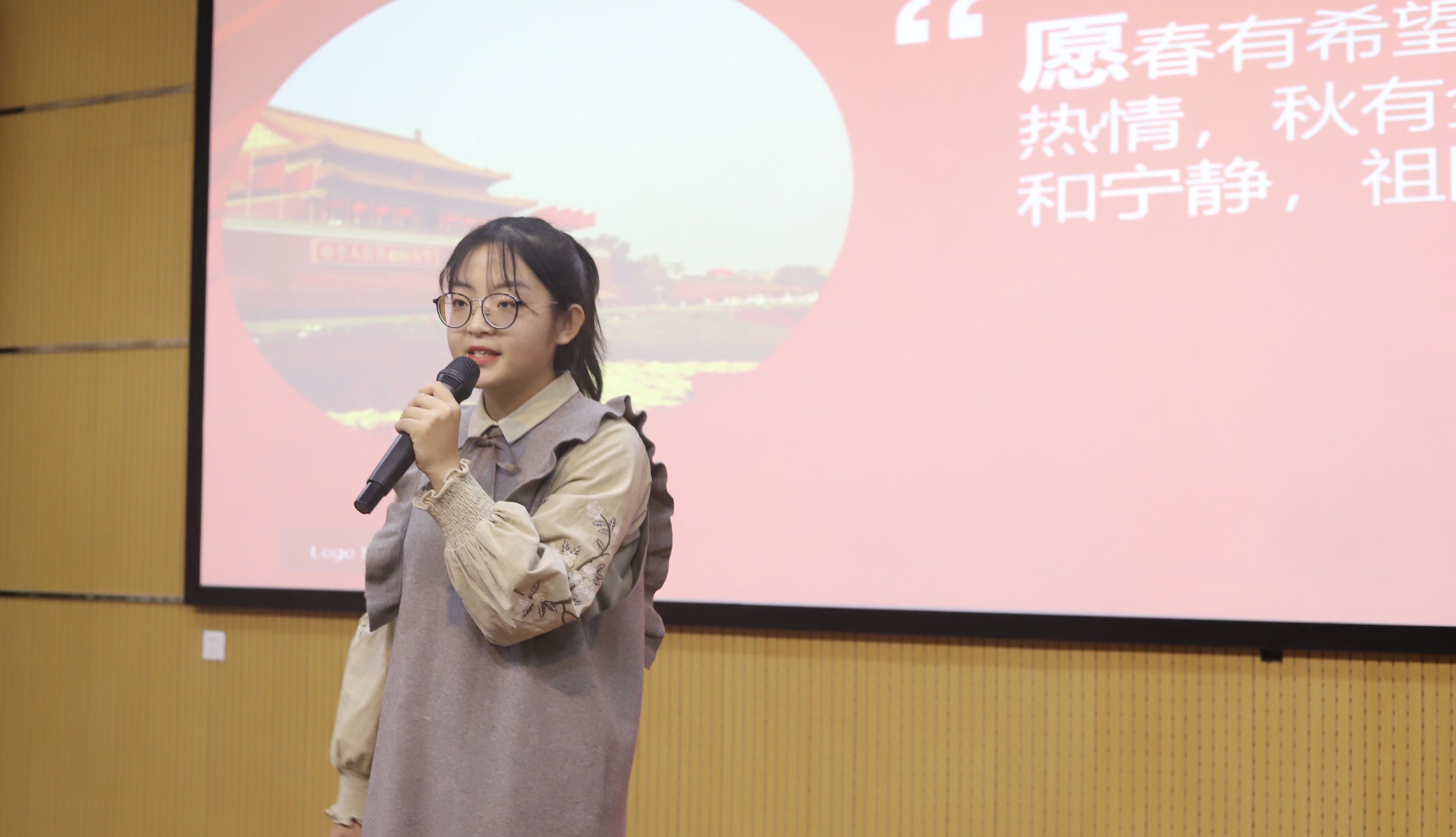 比赛正式开始,选手们在舞台上结合精美的PPT绘声绘色地进行演讲,收放自如,饱含深情,字字铿锵有力,展示了国教学子的才思与风采。二号选手熊乐萌给大家带来演讲《七十风雨 家国犹在》她用法语专业引出家国情怀这个话题,并告诉大家学习外语依旧要保持家国情怀。三号选手刘云鹤以《国际视野 家国情怀 使命》为题讲述青年的使命担当,她讲述出她老师曾说过的一句话:“我最大的快乐是为国家和民族奉献我的才智。”这句话让场下观众为之动容。五号选手齐梓彤带来演讲《不忘初心 续写辉煌》她用真切的语言,丰富的动作演说着中国的发展,眼里充满着对祖国的骄傲与自豪。七号选手杨睿以《重温初心,做自己的超级英雄》为题,用我们身边的例子梁声翕老人来告诉广大青年要不忘初心,坚定信念。
