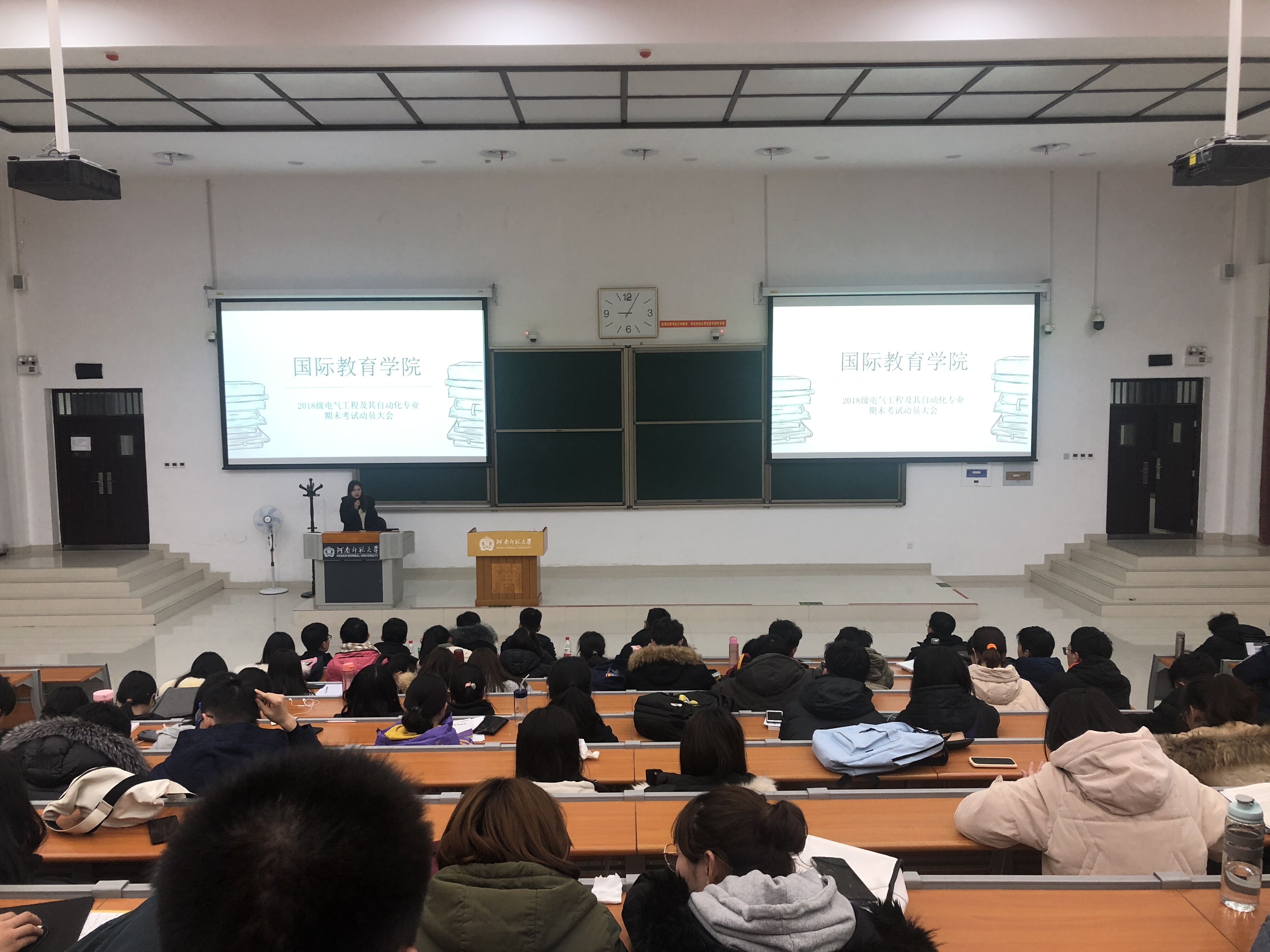 为严肃考风考纪,敦促每位同学严肃、诚信对待考试,12月16日晚,国际教育学院2018级电气工程及其自动化专业于东区综合楼102教室举行了期末考试动员会。此次会议由2018级辅导员孔若阳主持,2018级电气工程及其自动化专业全体学生到场聆听。