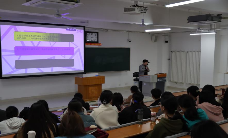 会议伊始,冯冬结合自身学习经历为同学们讲述了经济学科的学习经验,着重强调在学习中要把理论和实践相结合,把所学经济知识运用到实际经济生活中。同时也为同学们列举了未来就业途径和发展方向,并推荐可以考取的经济学类证书。随后,张磊为同学们详细地介绍了经济学学科概况,以及目前国内外经济发展前景和就业形式。之后,张磊分析了近几年经济学考研状况,建议大家多关注财经新闻,从多方面丰富自身知识、打实专业基础。会议最后,同学们积极踊跃提出问题,张磊进行现场答疑。