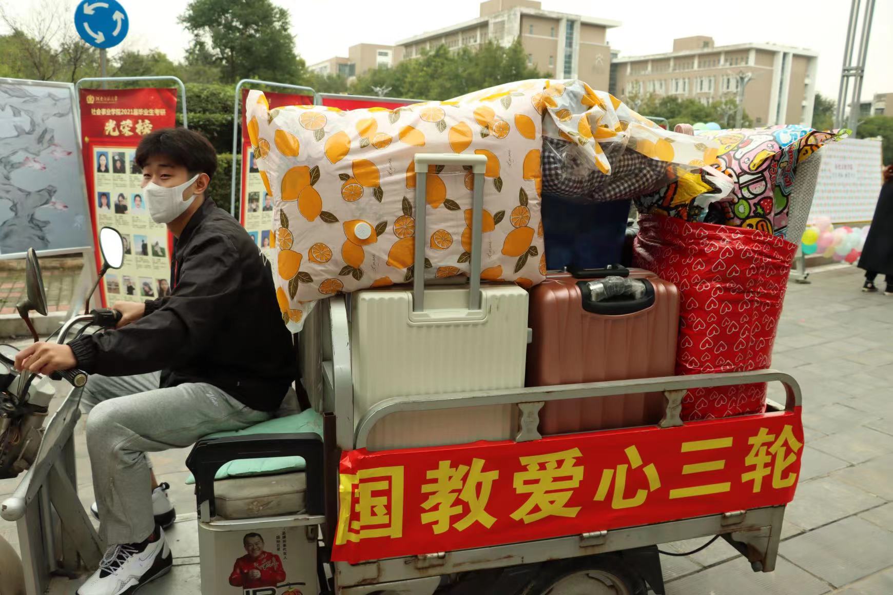 暖心为“新”,成长成才。迎新期间,学院领导多次到迎新现场,及时处理各种突发事项,并为新生答疑解惑,提供帮助。为了解决新生入校后搬运行李的难题,学院全天租赁8辆三轮车,不间断的从校门口将行李托运至宿舍楼下,并安排两百多名志愿者轮流在宿舍楼下负责搬运行李上楼。张贴“国教爱心三轮”标识的三轮车,成为了秋日校园一道亮丽的色彩。报到日晚上,党总支书记田小勇、副院长董海、党总支副书记白丽、副院长刘海涛一起来到新生宿舍,关心的询问新生生活和适应情况,并为过生日的三位新生送上定制版生日蛋糕,庆祝他们进入大学校园过的第一个生日,让新生不仅收获了惊喜,更感受到了学院的温暖。