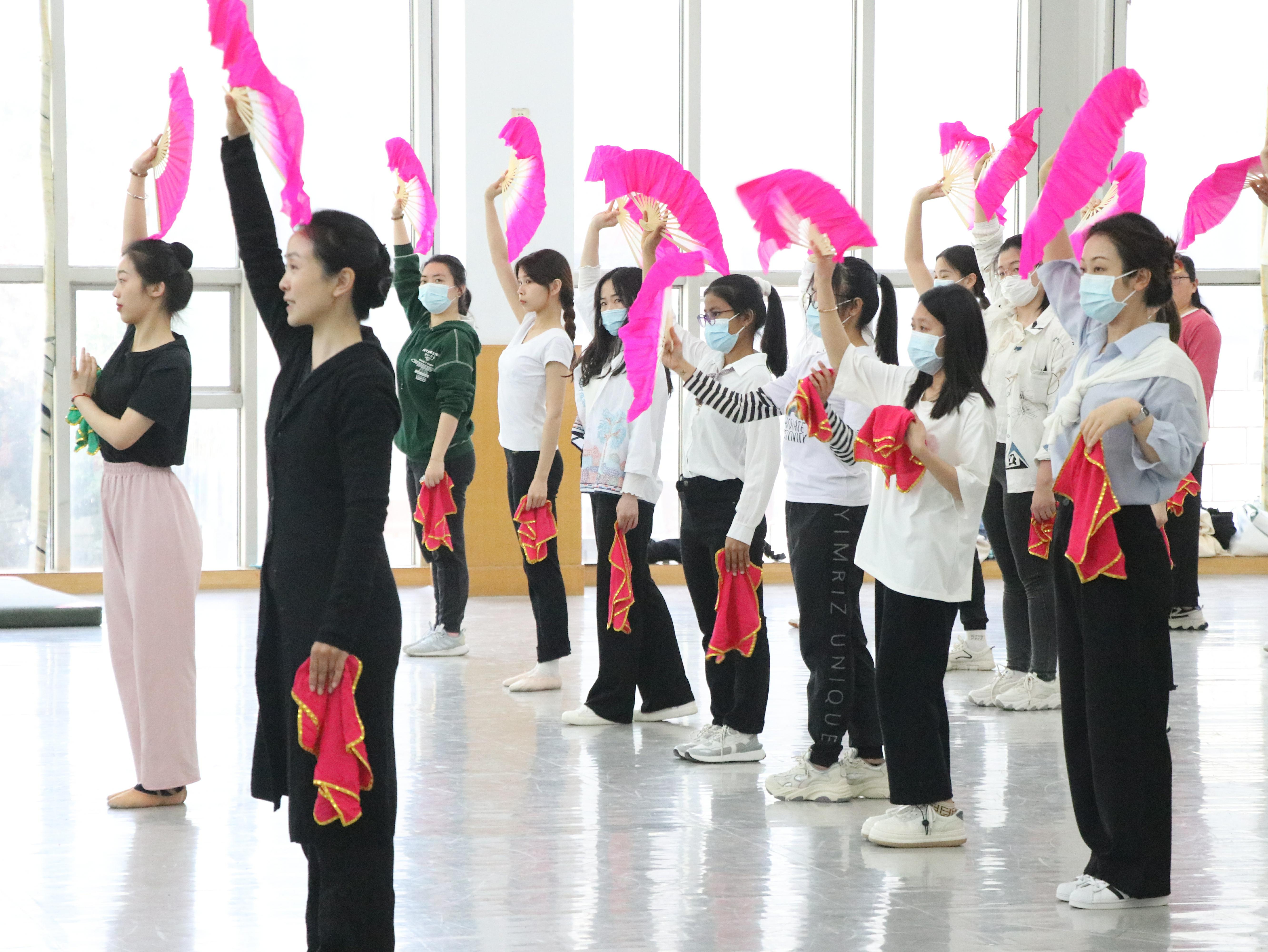 活动伊始,音乐舞蹈学院舞蹈系主任李晶晶为大家精要讲解了中国民族舞的发展历史、特点及其分类,舞蹈专业的同学现场展示了汉族舞、藏族舞、蒙古族舞、维吾尔族舞和傣族舞等民族舞蹈的不同风格,姿态优美灵动、情感表达细腻、饱含民族风情,让在场师生更多了解了舞蹈艺术的独有魅力和中华民族文化的深邃底蕴。随后,在喜庆优雅的乐曲伴奏和老师耐心细致的指导下,同学们手舞传统的粉扇和红帕跳起了充满“男刚女柔、螺旋摆动,三弯九动十八态”律动特色的汉族舞——胶州秧歌。虽然大家对文化内涵体验还不深、动作不大到位,但老师和同学们热情高涨、积极投入、自由宣泄、认真练习,表达了要将中华优秀传统文化“种在心里”和在师大学习生活满满的安全感、幸福感和获得感。活动在整齐优美的舞姿中落下帷幕。